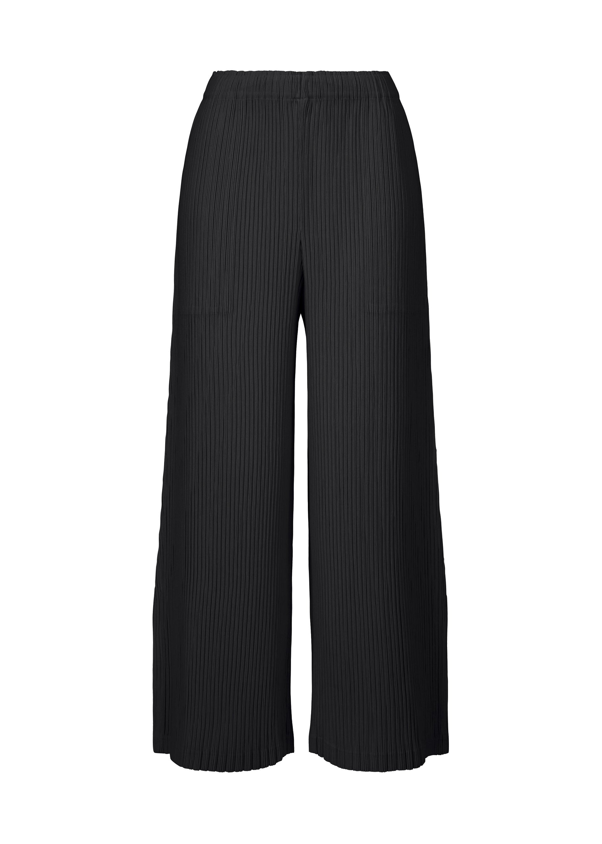 These pleated wide pants feature the appearance of hatching, which looks like a scratched drawing. They are made from polyester with a textured finish that is dry to the touch. The texture is created by applying fine pleats twice. Product Information Material: 100% polyester Made in Japan Waist specifications:rubber Pocket (position):Both sides Slit (position):Both sides