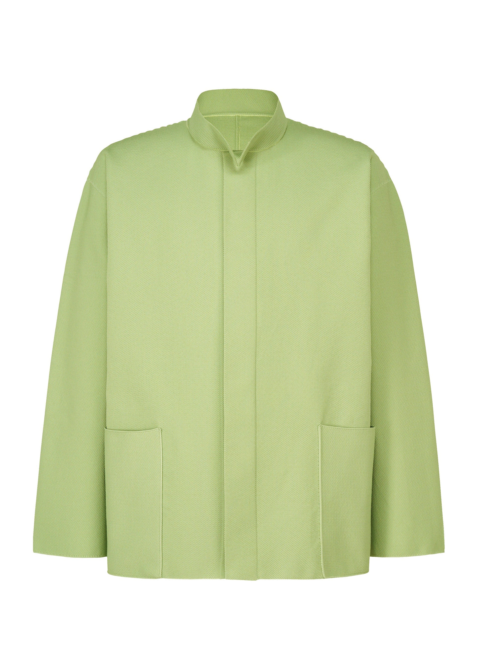 This knit jacket is characterized by its chambray look created using recycled polyester and wool. It is designed to be lightweight yet sturdy. There are pockets on both sides and a center vent at the back. Product Information Material: 80% polyester, 20% wool Country of origin: Japan neckline/collar:high neck Pocket (position):both sides Vent (position):center vent