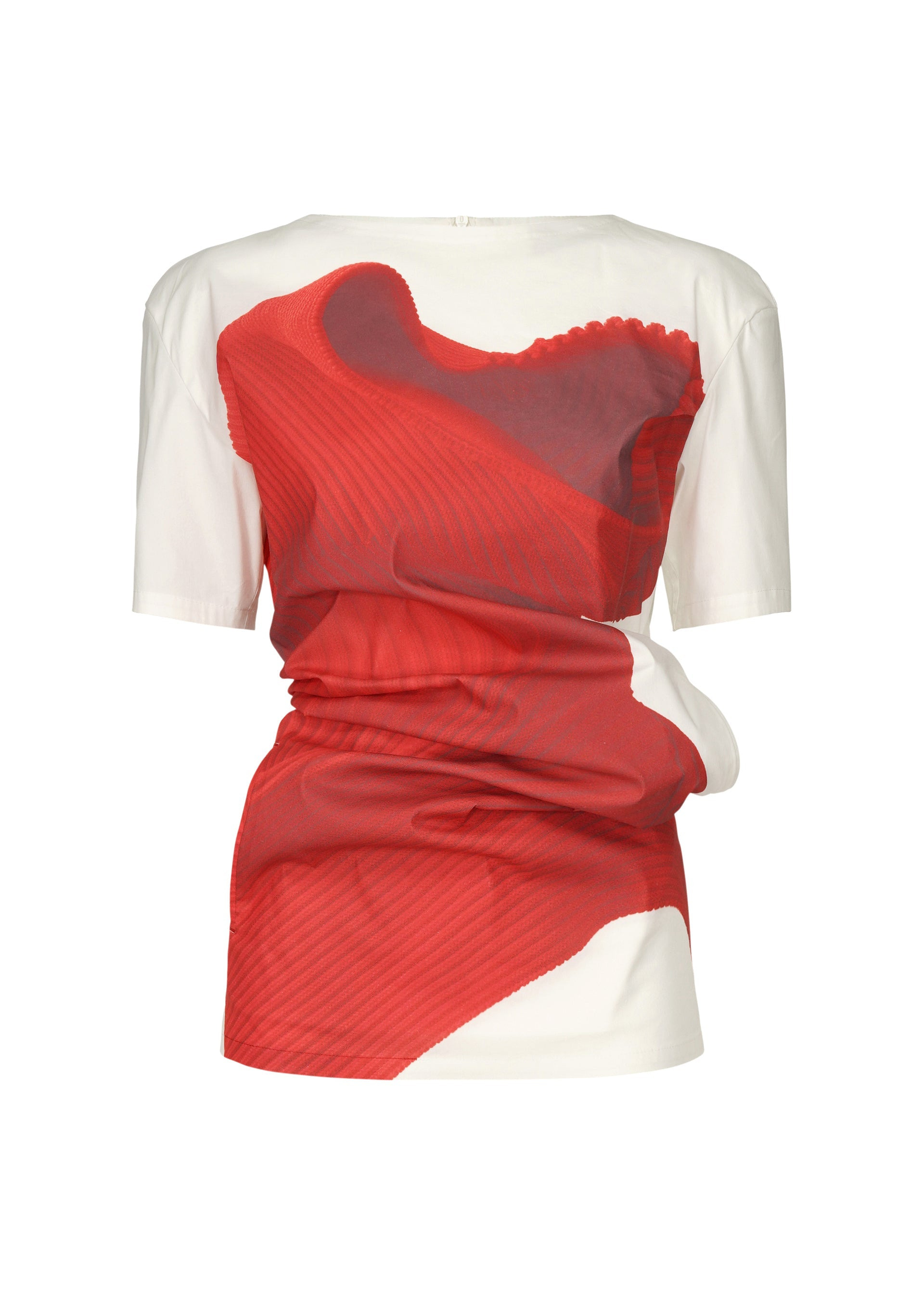 This round-neck short-sleeved top is inspired by an approach that connects clothing and art. Using the latest transfer technology, it is printed with high-resolution photographs of the "KNIT (AS IT IS)" knit series. The drapes and silhouettes in the pattern sometimes align with and sometimes diverge from the actual drapes and silhouettes of the garment, creating a sense of moving between three-dimensional and flat spaces. The design fits closely to the body, making the pattern appear three-dimensional when worn. Product Information Material: 55% cotton, 36% nylon, 9% polyurethane Made in Japan Neckline / Collar:Crew Neck Pocket (Position):Both Sides Others:Double Zip (Back)