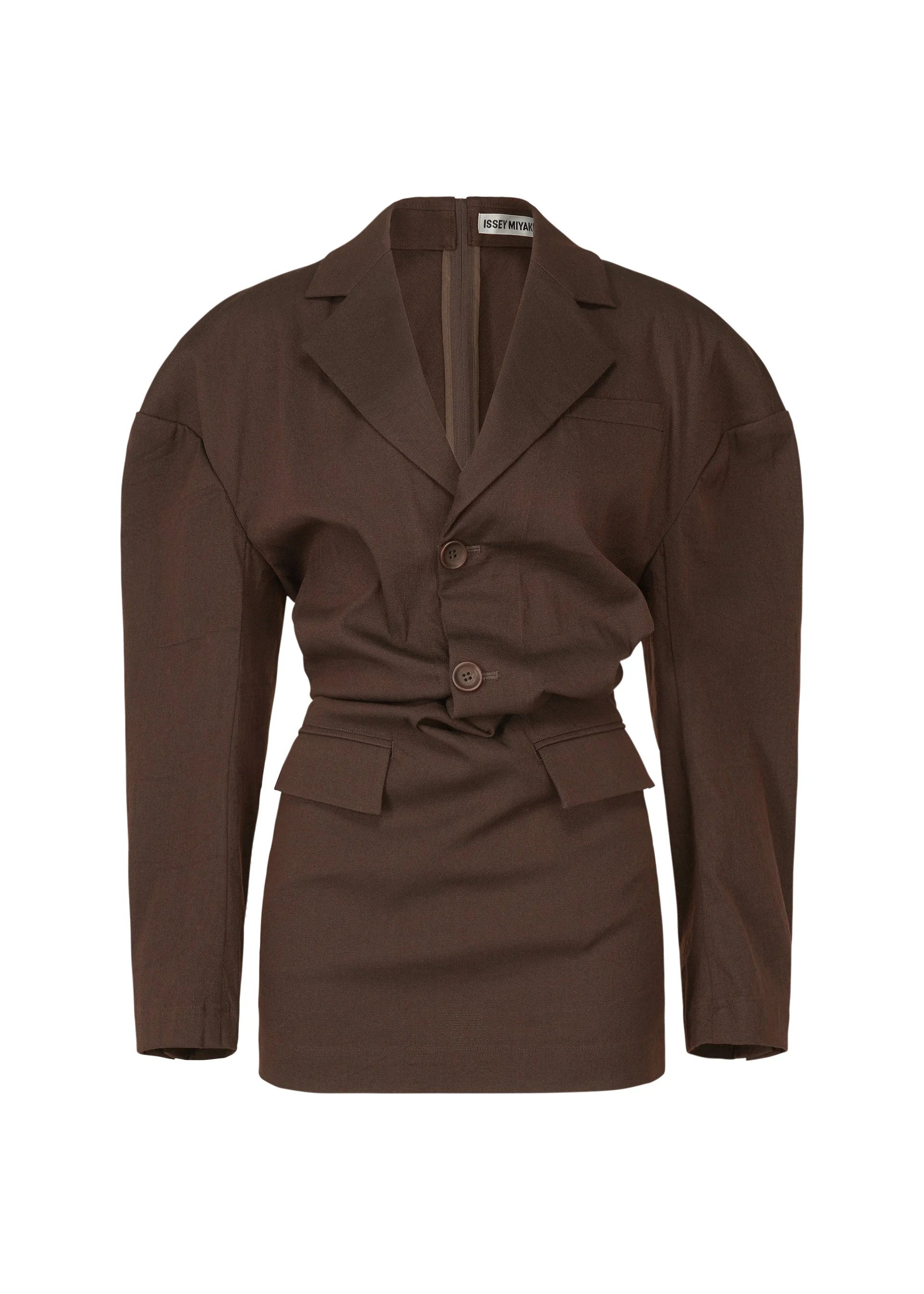 This long-sleeved tunic is characterized by its trompe-l'œil-like detailed design, made from Japanese Washi paper stretch fabric. Although the item appears to be a blazer, it is actually a tunic and evokes a feeling of surprise and dissonance. The weft combines Washi paper and wool for a stretchy material that conforms to the body, offering a supple, warm texture with a moderately firm feel. As you wear it, natural folds form along the slender silhouette, creating the sensation of wearing a sculpture. Product Information Material: 46% wool, 30% non-classified fiber (washi paper), 19% nylon, 5% polyurethane. Made in Japan. Neckline / Collar:Tailored collar Front opening:Half button Pocket (position):Left chest/both sides others:Double zipper (back)