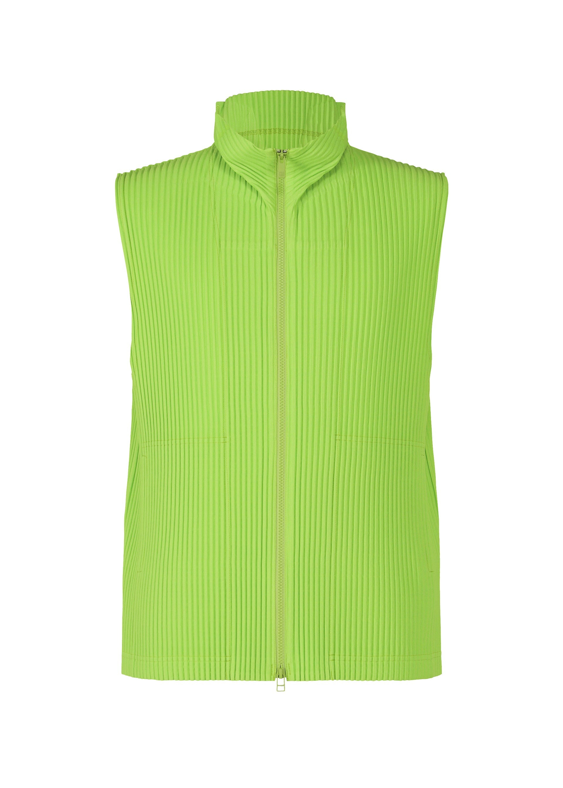 An open-front vest in gentle colors. It dries quickly, which is unique to polyester material, and is characterized by portability and light comfort. There are pockets on both sides. Product Information Material: 100% polyester Country of origin: Philippines neckline/collar:high neck Front opening:double zip Pocket (position):both sides
