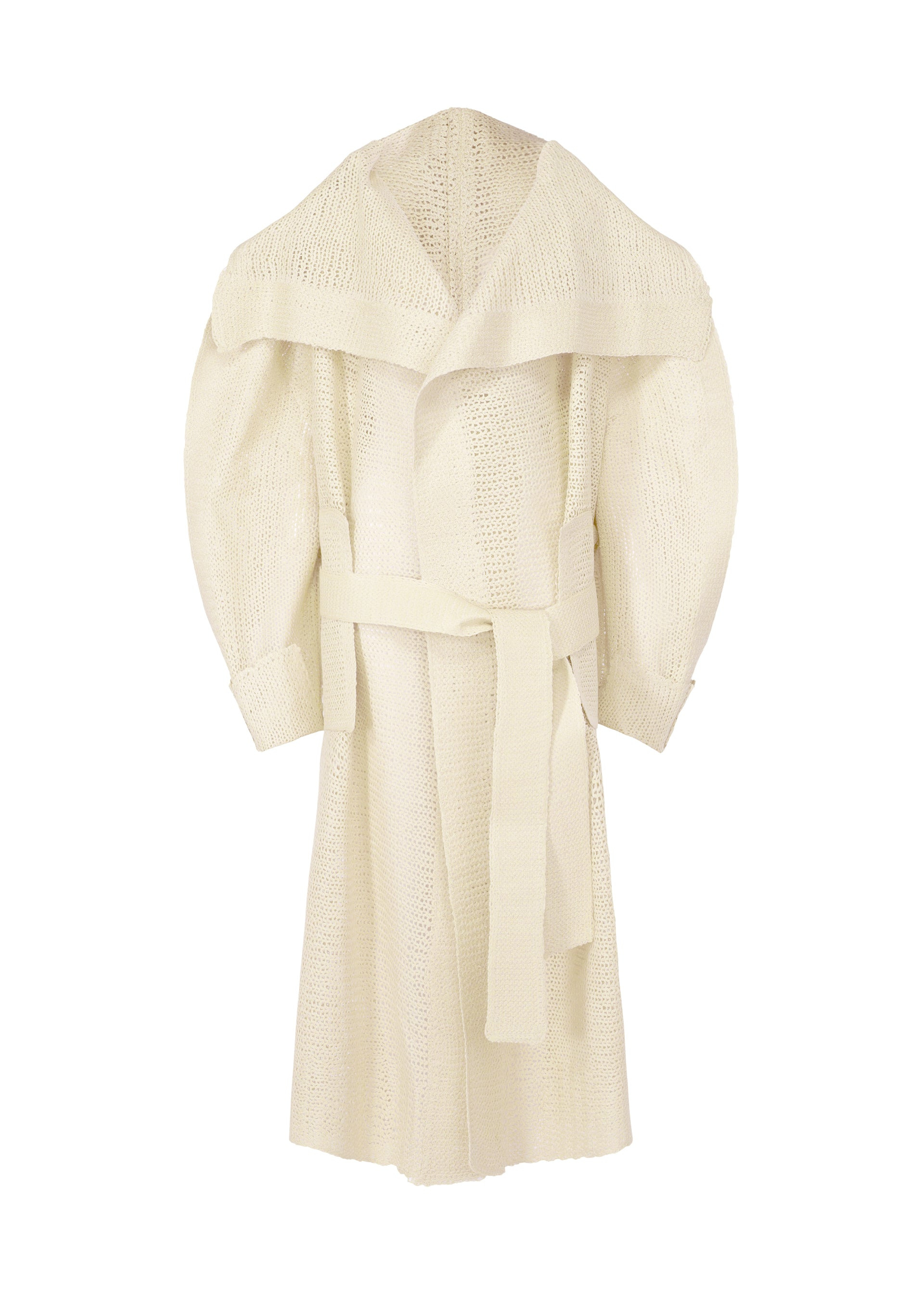 This long knit coat is characterized by its dynamic silhouette created through flat pressing. By pressing thermoplastic synthetic fibers with a wool and alpaca blend yarn, a crisp, rigid texture and subtle sheen not typically found in knitwear are achieved. Similar to sandwiching fillings in a panini, a mold is placed inside the garment during pressing, and the edges where nothing is sandwiched are firmly fused as the knit fabric meets. Due to the manufacturing process and characteristics of the material, the texture and fit vary from item to item. Please note this in advance. Product Information Material: 62% wool, 27% alpaca, 11% polyester. Made in Japan. Pocket (position):Both sides Vent (location):Center vent accessories:Belt made from the same fabric