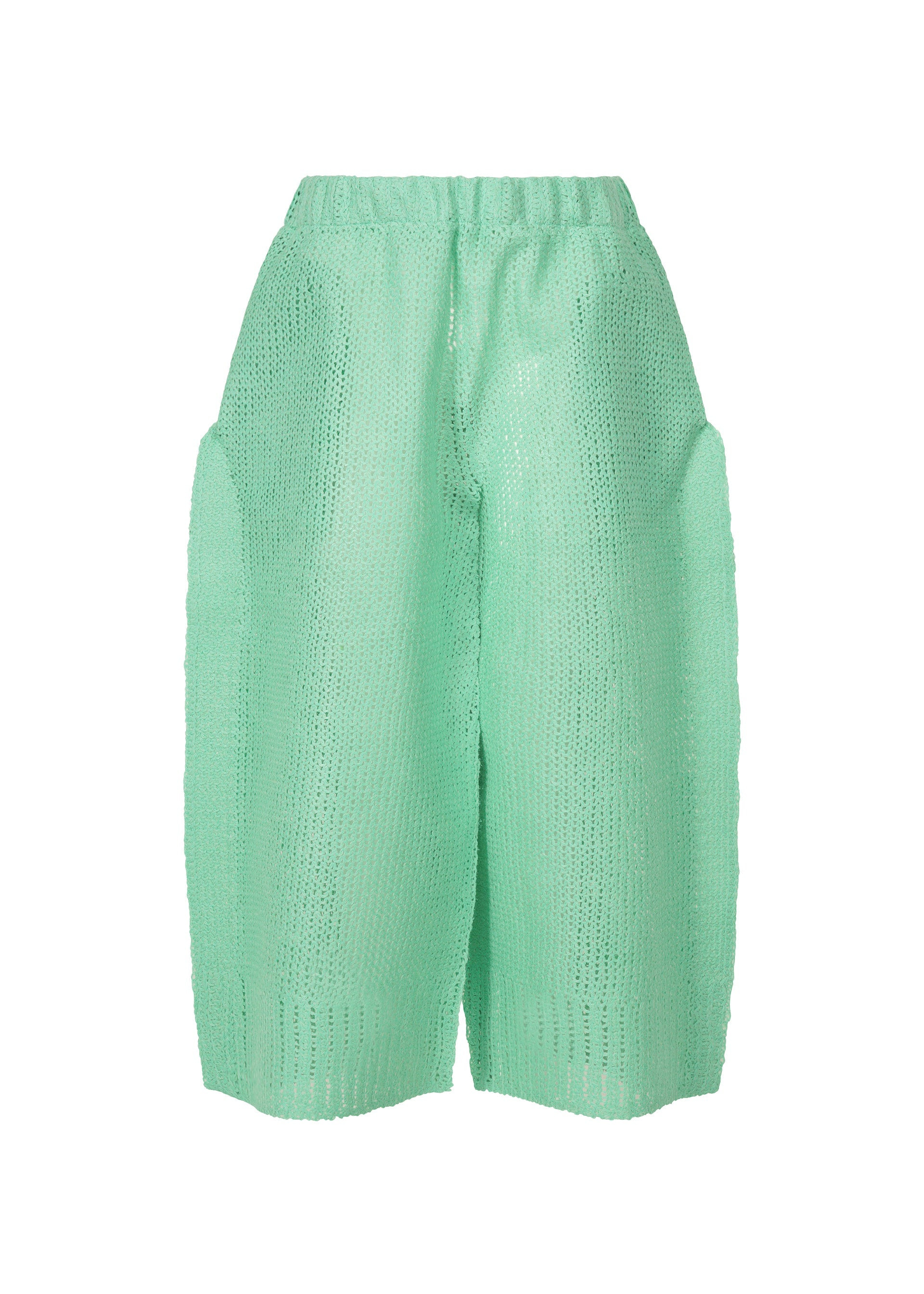 These knit pants are characterized by their dynamic silhouette created through flat pressing. By pressing thermoplastic synthetic fibers with a wool and alpaca blend yarn, a crisp, rigid texture and subtle sheen not typically found in knitwear are achieved. Similar to sandwiching fillings in a panini, a mold is placed inside the garment during pressing, and the edges where nothing is sandwiched are firmly fused as the knit fabric meets. Due to the manufacturing process and characteristics of the material, the texture and fit vary from item to item. Please note this in advance. Product Information Material: 62% wool, 27% alpaca, 11% polyester. Made in Japan. Waist specifications:rubber Pocket (position):Front and back, both sides