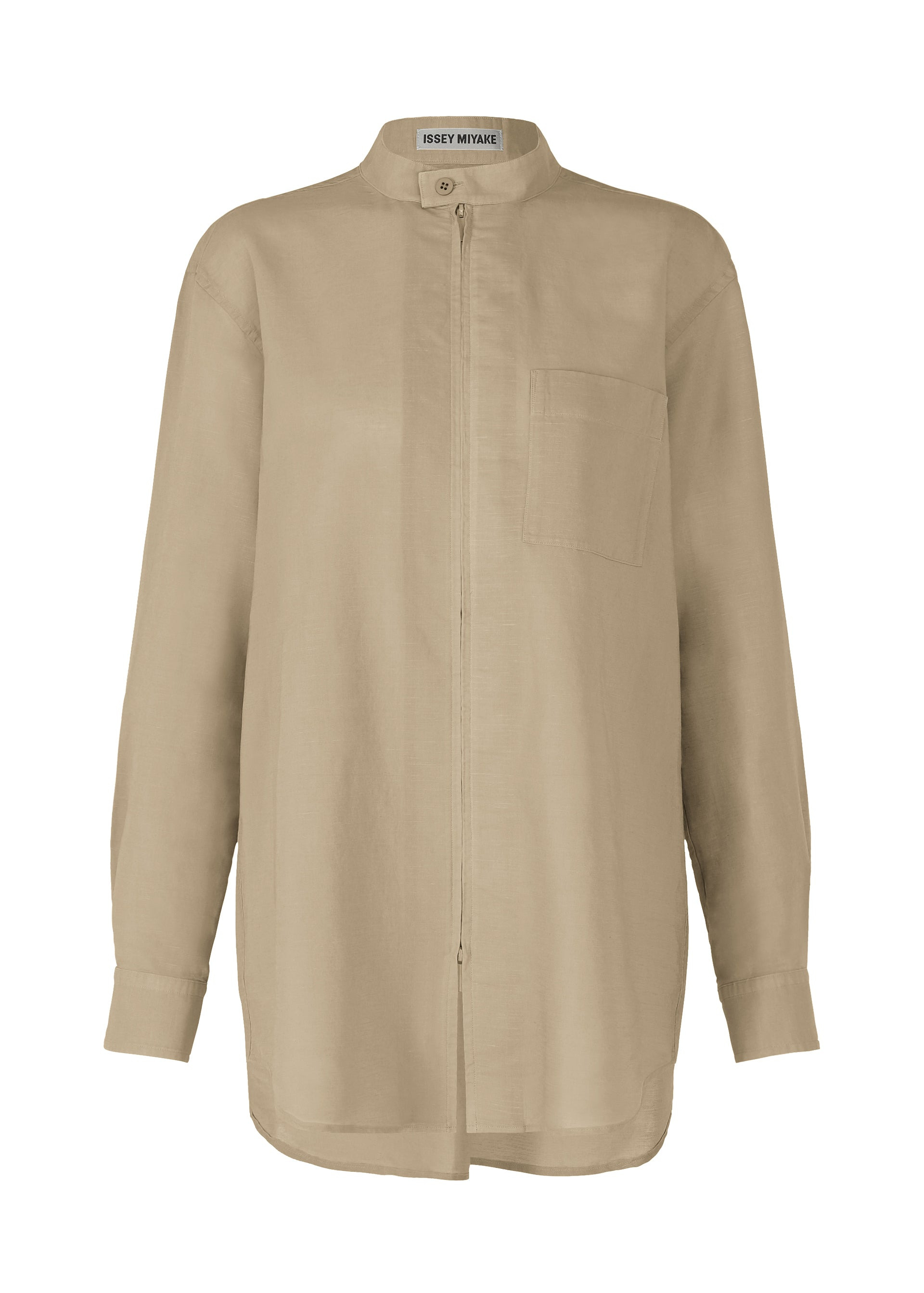 This shirt with a standing collar is characterized by its taut yet comfortable texture and zip-up design. It is made from thin cotton/linen shirt fabric with a rich slub texture. The fabric undergoes low-temperature mercerization processing once to enhance its firmness, tautness, and crispness. By slowly garment-dyeing the shirt at a low temperature after sewing, the taut fabric takes on a soft texture akin to crumpled paper, with a comfortable feel against the skin. Product Information Material: 60% cotton, 40% linen Country of origin: Japan