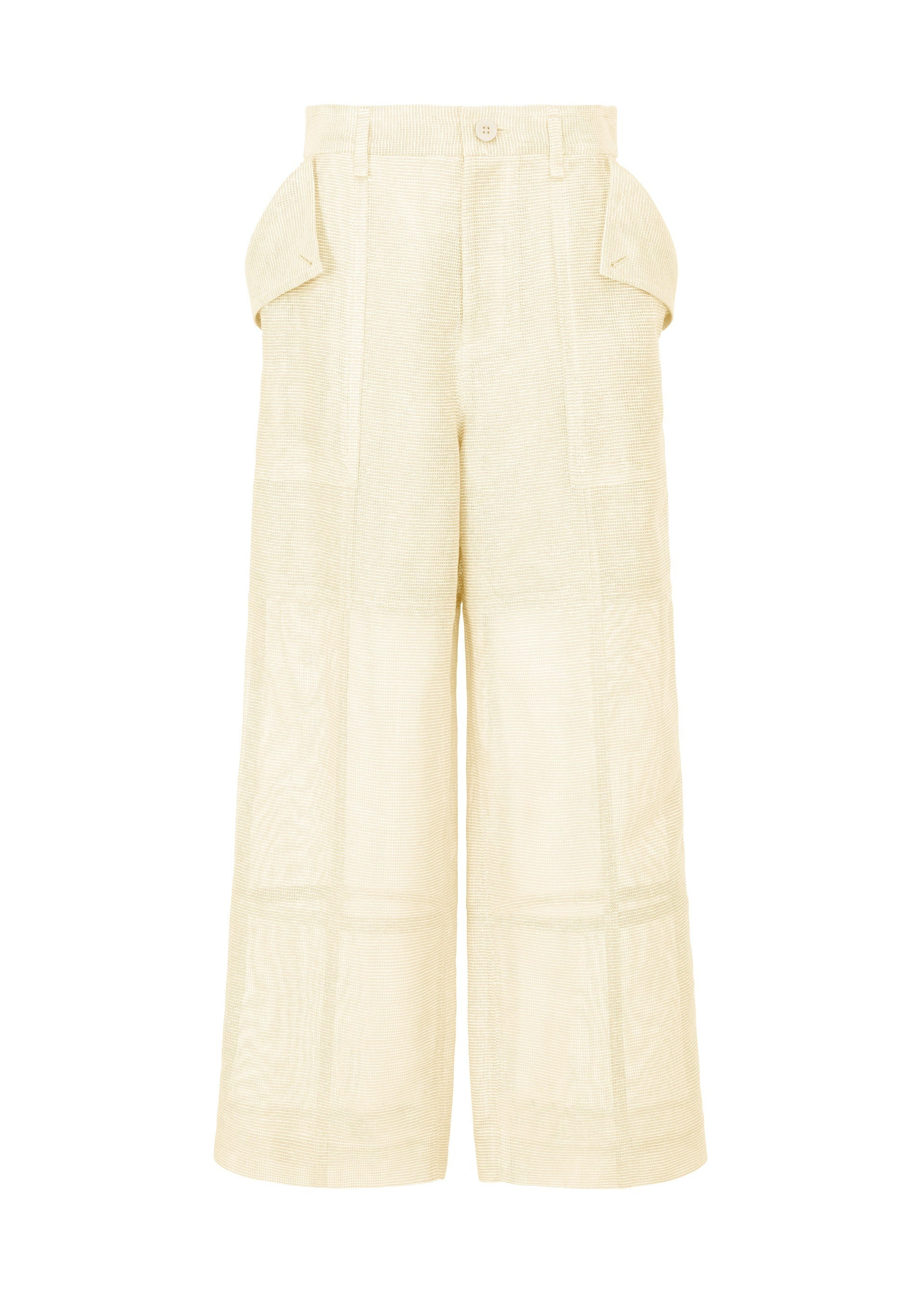 These straight pants are made from fabric with a unique texture, inspired by paper in ancient times made from the papyrus plant. The fabric is woven by intertwining thick cotton, ramie, and Japanese Washi paper threads, each dyed in subtly different tones, creating a moderate sheerness and rich color depth. They are characterized by their grid-like tape design that makes you sense a framework. The tape is applied to follow the body’s lines and functions as buttonholes. Product Information Material: Unclassified fiber (Japanese paper) 45% Ramie 38% Cotton 17% Tape: 100% cotton Lining: Unclassified fiber (Japanese paper) 45% Ramie 38% Cotton 17% Country of origin: Japan Waist specifications:button/belt loop Front opening specification:zip fly Pocket (position):Both front and rear sides