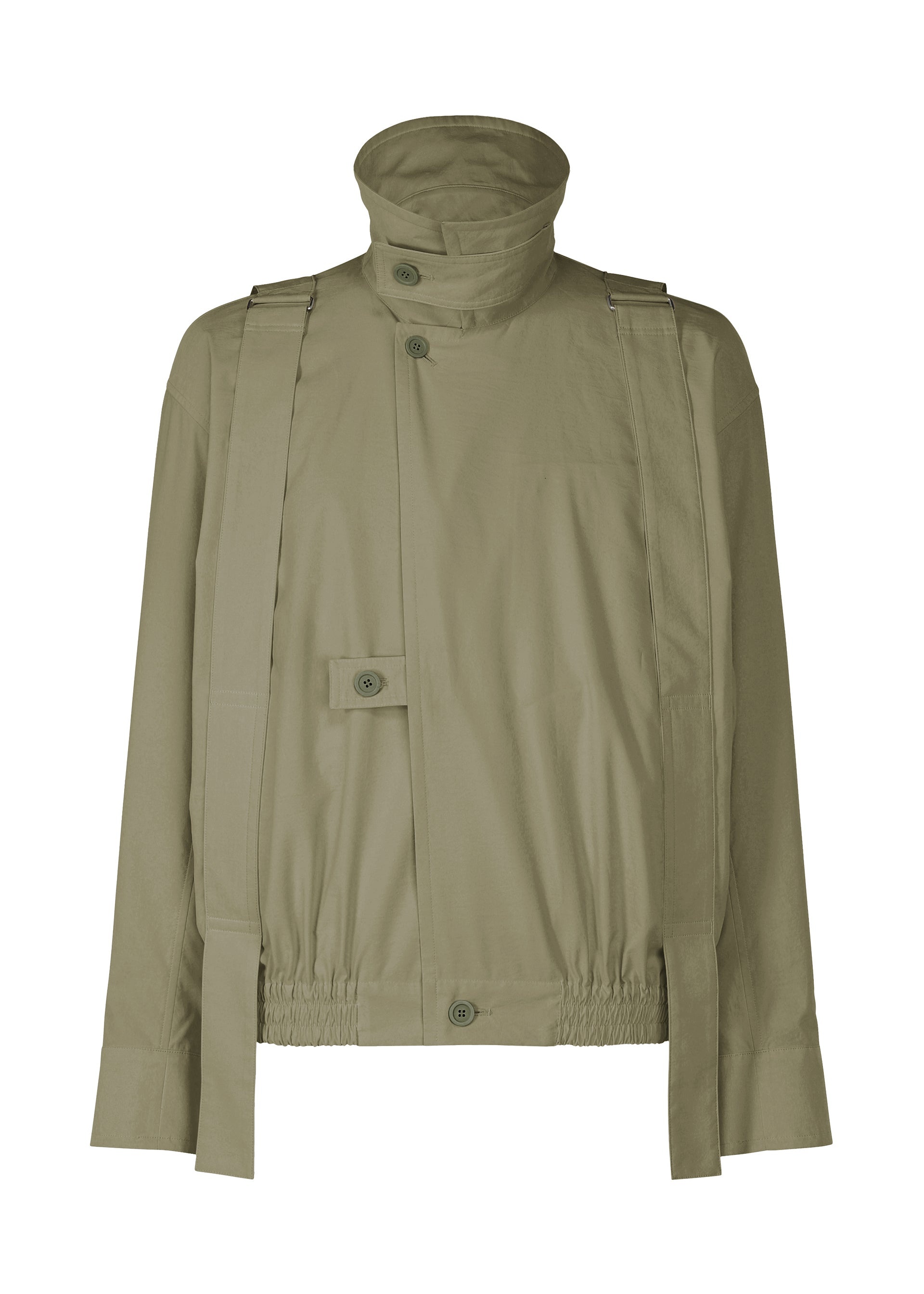 This jacket is inspired by wearing a parachute. The shoulder straps, resembling a harness, give the look of preparing to leap. The design is crafted to allow air to flow through it when worn, just like a parachute. It can be compactly rolled up and secured with the inner strap for easy portable functionality. It has pockets on both sides.