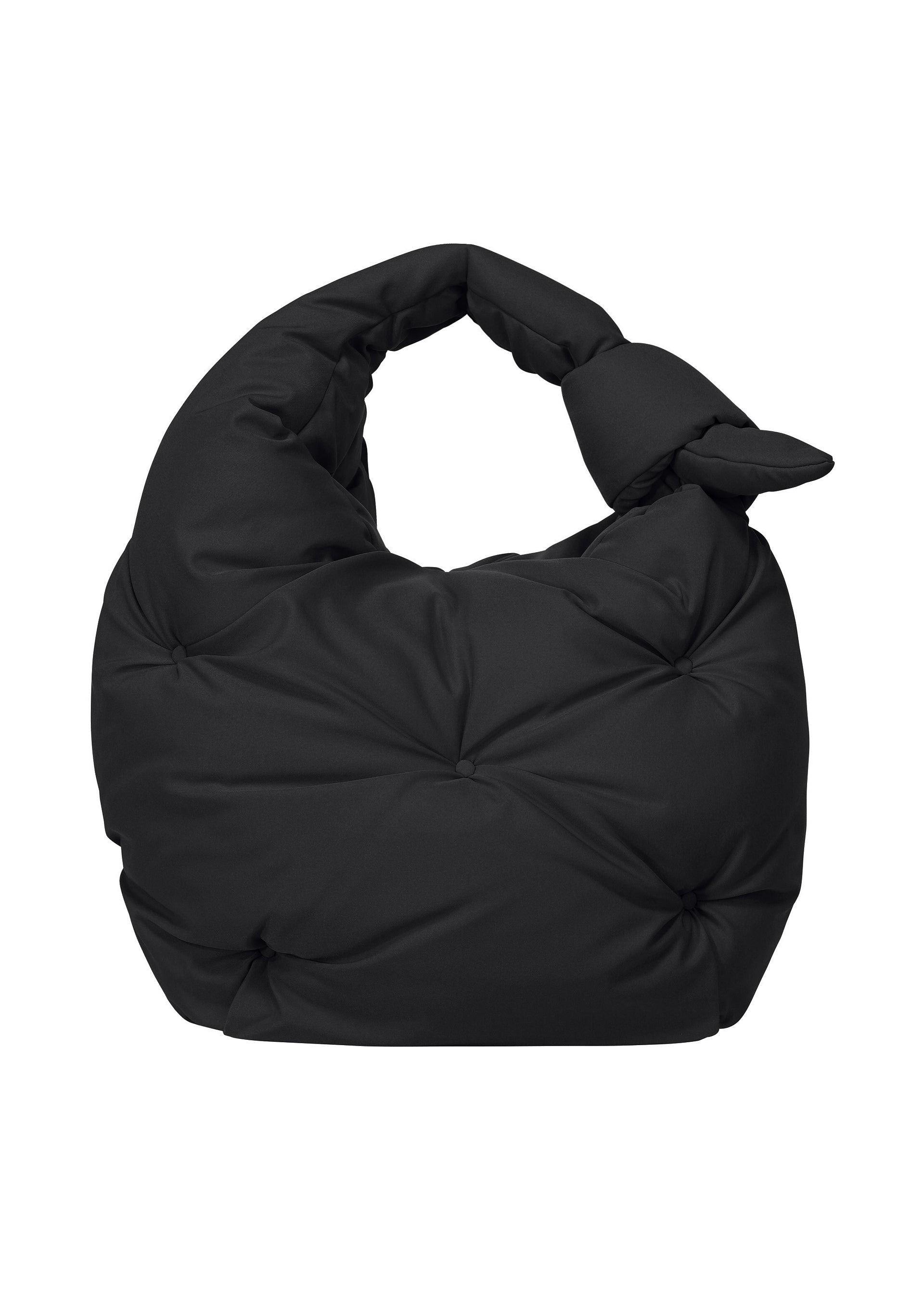 This bag is characterized by its details resembling traditional Japanese zabuton floor cushions and regular cushions, as well as its thick, padded form. Its voluminous appearance expresses the state of materials or objects already existing inside the bag. This design creates an off-kilter feel by making a bag that should be complete only when filled with items appear as if something is already inside, even when it’s empty. The handles can be tied to adjust their length. Product Information Material: 100% Polyester Lining: 100% Polyester Filling: 100% Polyester Made in Japan Inner pocket:can be Opening and closing section:snap button