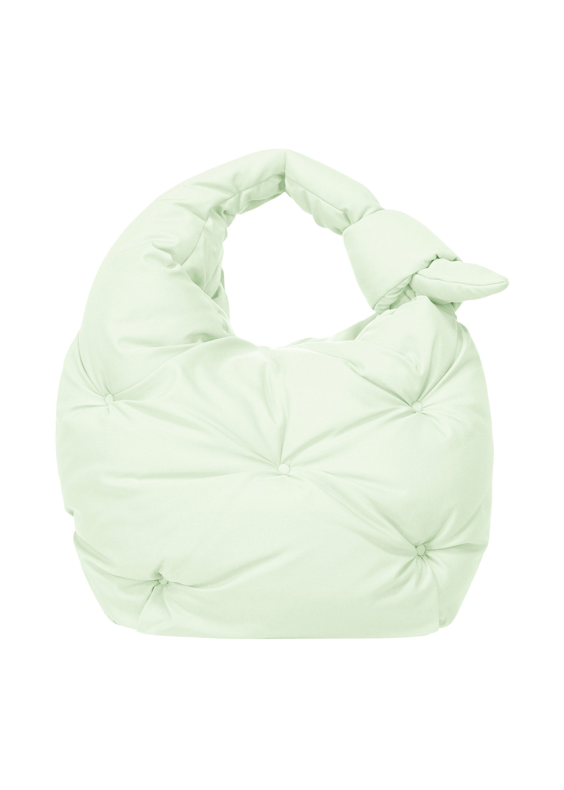 This bag is characterized by its details resembling traditional Japanese zabuton floor cushions and regular cushions, as well as its thick, padded form. Its voluminous appearance expresses the state of materials or objects already existing inside the bag. This design creates an off-kilter feel by making a bag that should be complete only when filled with items appear as if something is already inside, even when it’s empty. The handles can be tied to adjust their length. Product Information Material: 100% Polyester Lining: 100% Polyester Filling: 100% Polyester Made in Japan Inner pocket:can be Opening and closing section:snap button