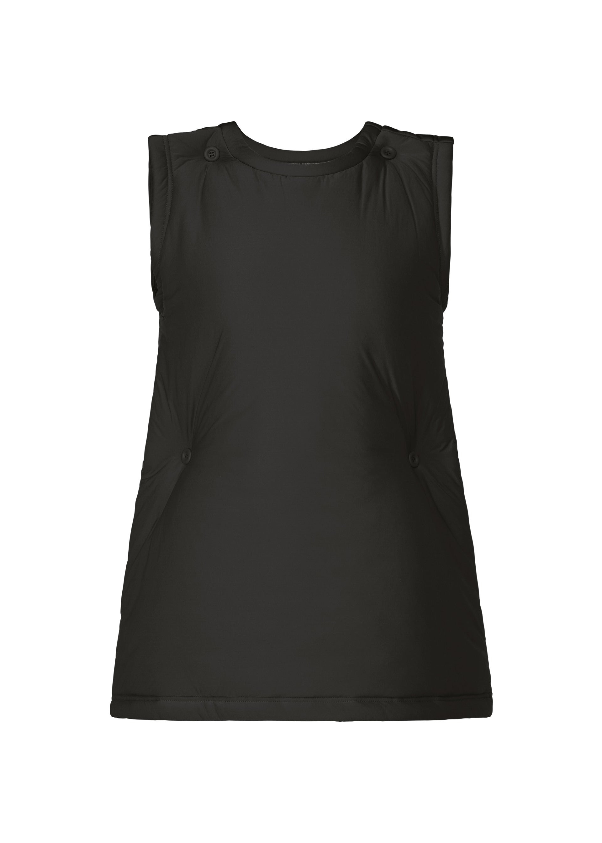 This round-neck, sleeveless tunic features inner padding. The unique, billowing form and soft, comfortable feel are achieved by inserting a sheet of padding between layers of ultra-high-density (46-gauge) stretch jersey material. While maintaining a basic silhouette, the added padding gives the tunic a distinctive presence. Product Information Material: 90% nylon, 10% polyurethane Lining: 90% nylon, 10% polyurethane Filling: 100% polyester Made in Japan Neckline / Collar:crew neck others:Buttons (both shoulders)