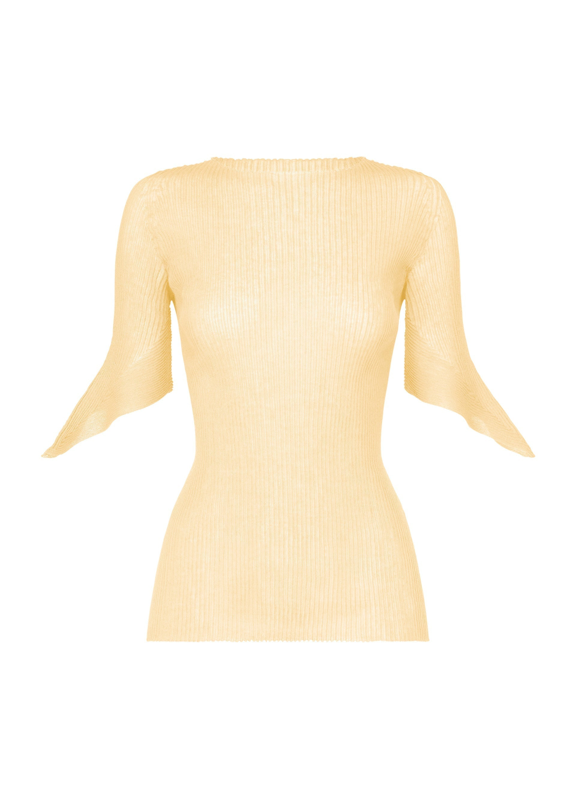 This short-sleeved knit top is characterized by its moderate sheerness and sleeve design. Enjoy the moderately crisp texture created through the use of polyester and ramie. Product Information Material: 77% polyester, 23% ramie Made in Japan Neckline / Collar:Crew neck