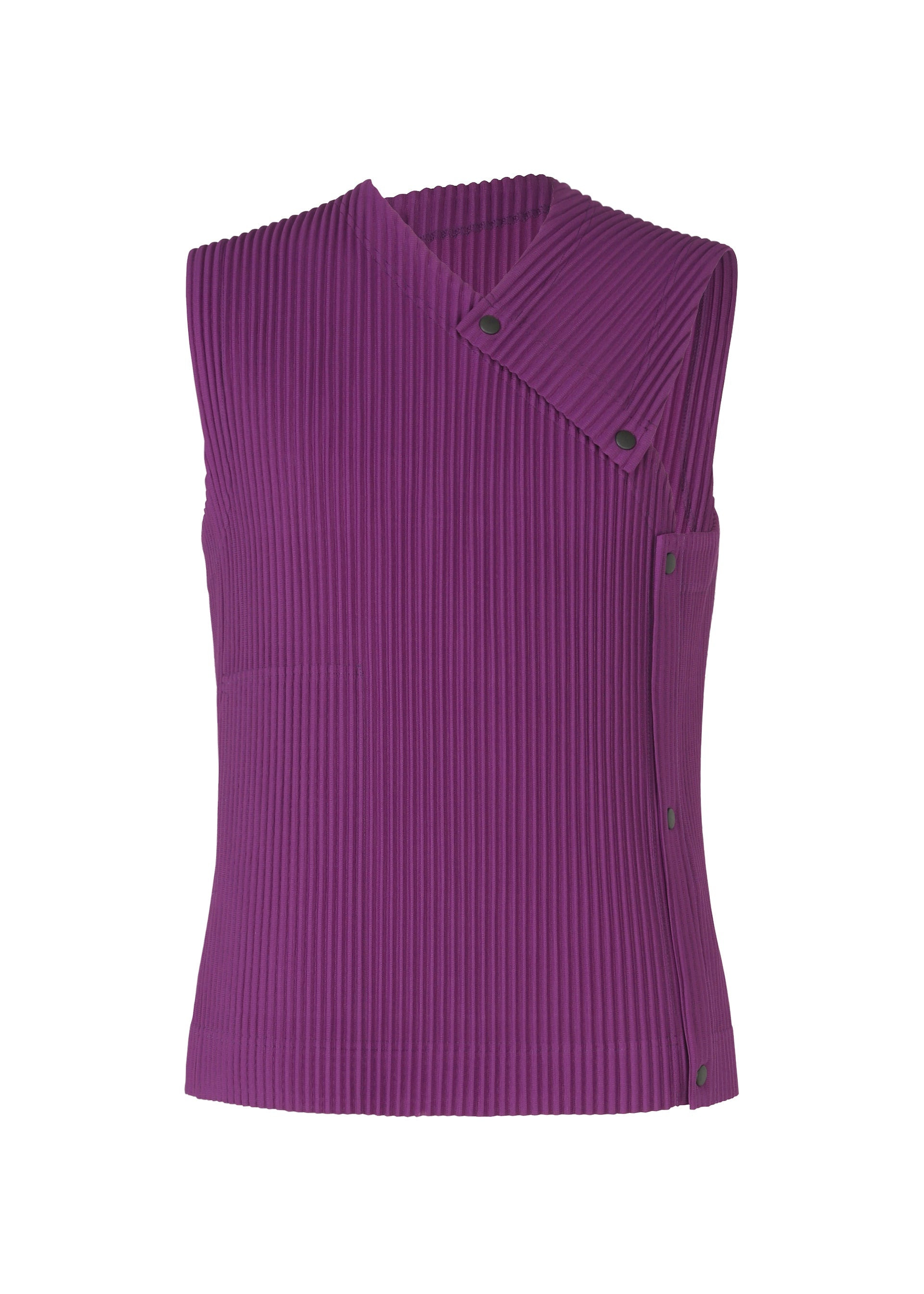 This vest is created by flattening the shape of a stone and reconstructing it into a garment pattern. It can be worn in a variety of ways by overlapping and fastening the buttoned parts. The light, organic design evokes the layered look of clouds. Product Information Material: 100% polyester Made in Japan Pocket (position):right others:Button (left)