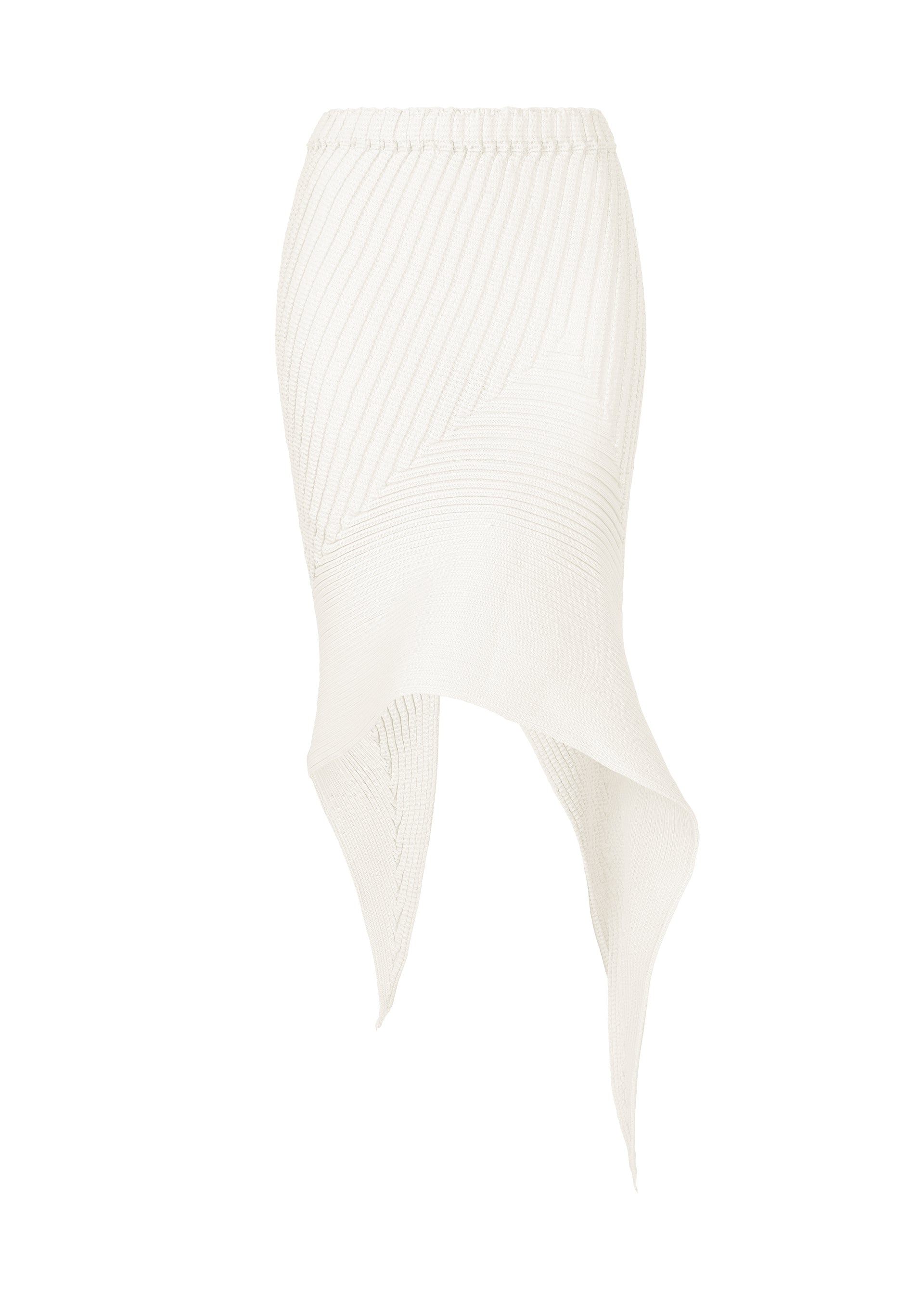 This knit skirt is characterized by its structure resembling drooping quadrilateral paper and light, comfortable feel. It is knitted using highly stretchy recycled polyester thread combined with delicate, glossy triacetate thread in a striped pattern. Quadrilateral parts, created by blending garter and rib knitting techniques, are assembled with minimal sewing to achieve a soft form. Product Information Material: 58% polyester, 42% triacetate Country of origin: Japan Waist specifications:rubber