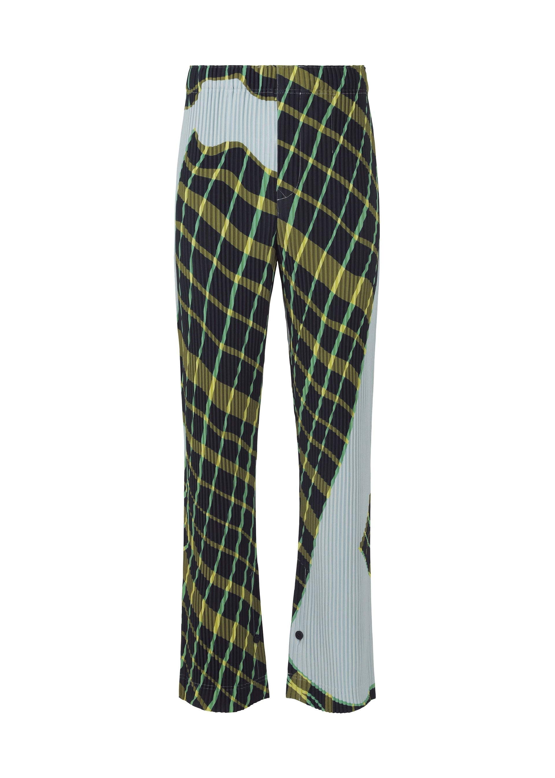 These pants have an impressive pattern composed by capturing the moment when the plaid-patterned fabric flutters in the wind. They express the fun, wonder, and spontaneity of the plaid pattern being naturally distorted by the force of the wind. They have an inner slit, pockets on both sides, and an inner draw cord. They have a button-fly design. Product Information Material: 100% polyester Country of origin: Japan Waist specifications:Rubber/Drawcord Front opening specification:button fly Pocket (position):both sides Slit (position):inside その他:ボタン(裾)