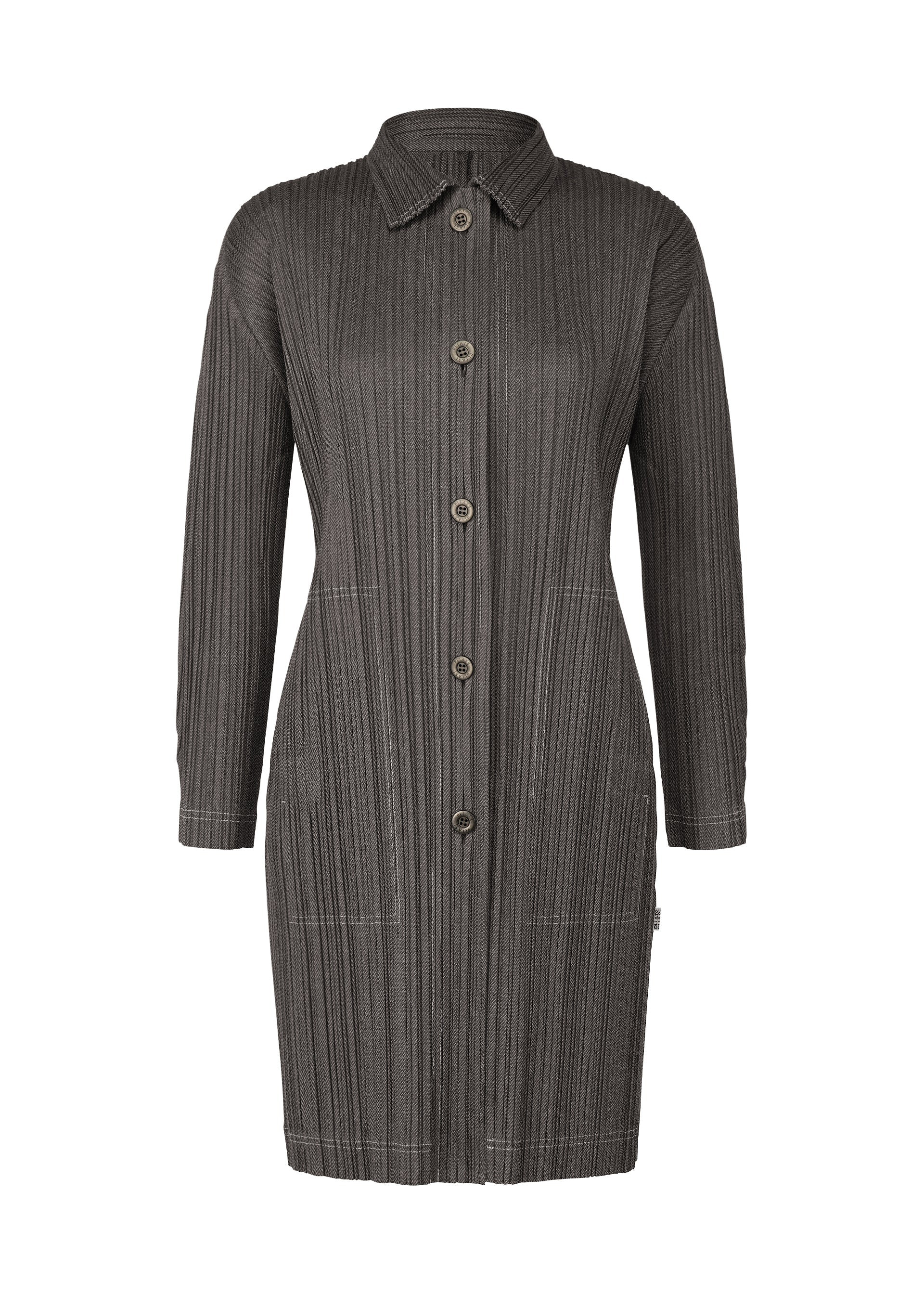 This long, collared coat with long sleeves is from a series that pursues a denim-like feel with a cotton-blend textile. It features stitching in an accent color. It has a buttoned style with pockets on both sides. Product Information Material: 76% polyester, 24% cotton Made in Japan Neckline / Collar:Regular Color Front opening:button Pocket (position):Both sides