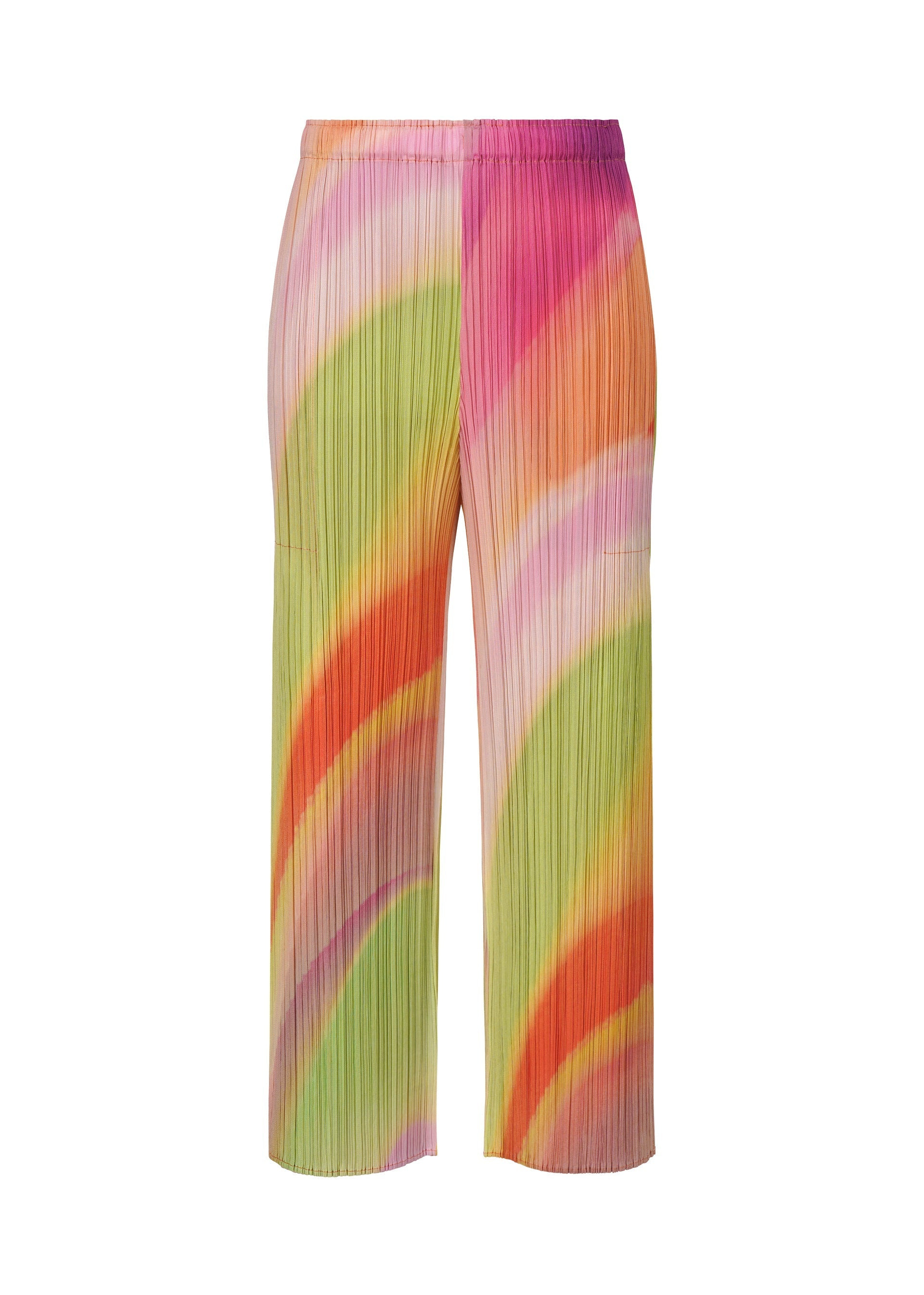 These wide pants feature a colorful gradation print inspired by groovy rhythmic waves. It is recommended to style them with solid-colored pleated items. They have pockets and slits on both sides. Product Information Material: 100% polyester Made in Japan Waist specifications:rubber Pocket (position):Both sides Slit (position):Both sides