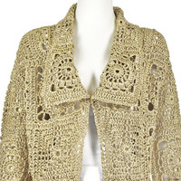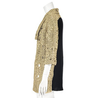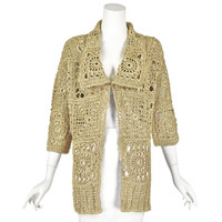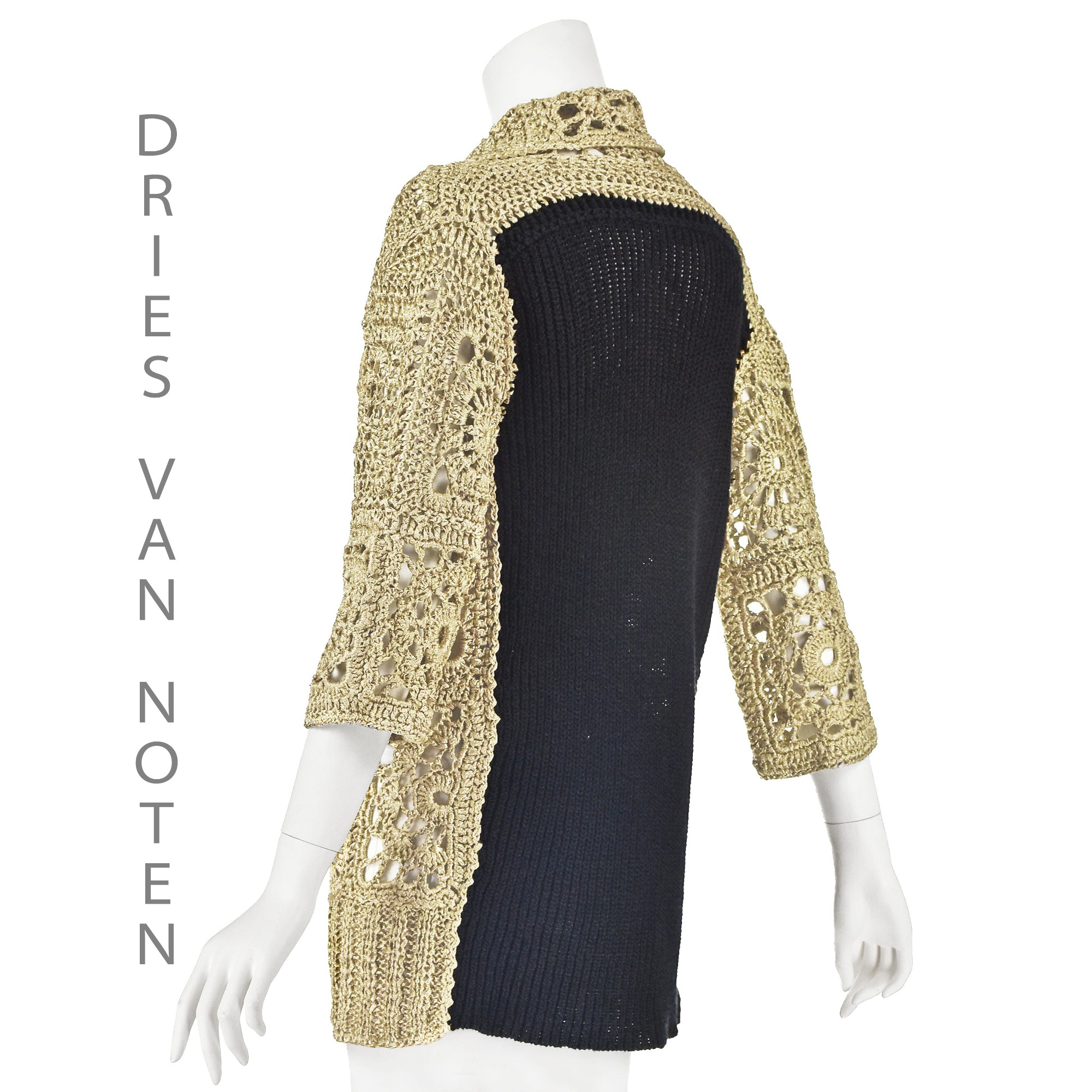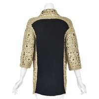 This edgy gold and black cardigan from Dries van Noten is spot on the granny chic trend with its combination of vintage and modern elements. The front and sleeves are made in exaggerated "granny squares" crocheted with pale metallic gold ribbon juxtaposed with a chunky black knit on the back. The open cardigan has a wide collar and elbow-length sleeves. The best reference for both the gold color and the size of the black knit is in the last photo with the label. There are five fabrics listed, but unfortunately, the tag doesn't identify which comprise the crocheted ribbons and which are the black yarn: 60% polyester, 17% polyamide, 9% cotton, 7% silk, and 7% linen. Labeled size Large. Refer to the measurements for the best guidance regarding actual size and compare with a similar garment that fits you. MEASUREMENTS - Shoulder width is 20" - Chest is 44" - Waist is 42" - Sleeve length is 15.5" - Length is 30" down center back. CONDITION Excellent condition with no apparent flaws. RETURNS Returns are accepted only if we are notified via email within three days after you’ve received your purchase, including your reason for the return. DO NOT SHIP UNTIL YOU HAVE OUR APPROVAL. We must receive your return within seven days after we approve it. The cost of return shipping is the buyer's responsibility. There is a 5% restocking fee for all returns. This fee can be waived at our discretion if we made a significant error in a listing.