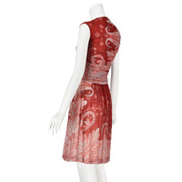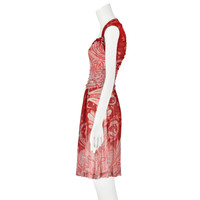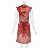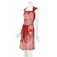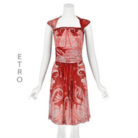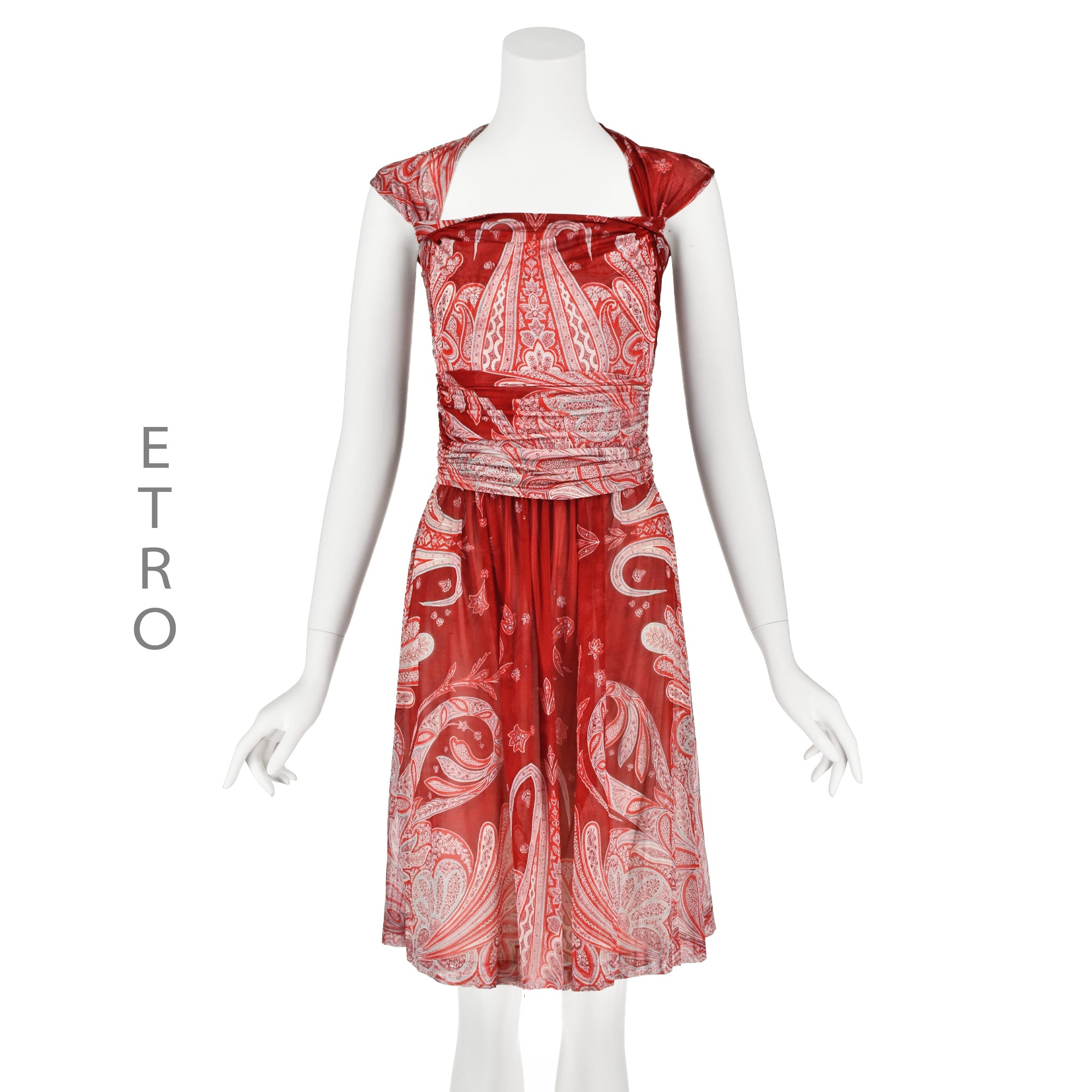 Etro has once again created a gorgeous print based on their signature paisley motif, this time in red and white with silvery accents. And if you're looking for the perfect day to evening dress that's light as a feather and perfect for travel, this has to be it! The fabric is a semi-sheer viscose knit with 13% elastane for stretch. The top of the dress has straps that hint at a cap sleeve, and the neckline runs straight across between the straps. Around the midsection is a wide cummerbund that is tightly gathered - or ruched - at each side seam. The top is lined in a second layer of the shell fabric. The full skirt has an elastic waist and a finished hem. Underneath the skirt is an opaque white viscose "slip." The dress is a pullover style with no additional closure. Labeled Italian size 42, which is considered equivalent to a US size 6. We are recommending the dress for size Small, or 4-6. Please refer to the measurements for the best guidance regarding actual size and compare with a similar garment that fits you. This dress is very stretchy. MEASUREMENTS - Underarm chest measurement is 32" - Waist is 24" - Hips are free. - Length is 41" down center back. CONDITION Excellent condition with no significant flaws. RETURNS Returns are accepted only if we are notified by you via email within three days after receiving your purchase. DO NOT SHIP UNTIL YOU HAVE OUR APPROVAL. We must receive your return within seven days after we approve it. The cost of return shipping is the buyer's responsibility. There is a 5% restocking fee for all returns. This fee can be waived at our discretion if we made a significant error in a listing.