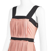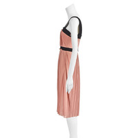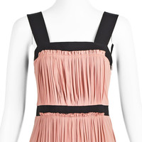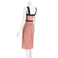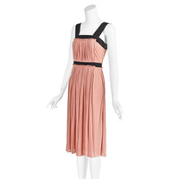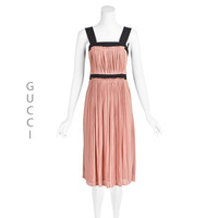 Cute Gucci casual dress is a "pink-with-a-hint-of-coral" lightweight knit fabric densely pleated down the middle of the bodice and skirt in front and down the skirt in back. The black straps and waistband are made with wide grosgrain ribbon that offers a striking contrast to the color of the dress. The dress is fully lined and closes with a side zipper. The shell fabric is 72% viscose and 28% polyester; the sheer lining is a 100% viscose knit. Labeled size Small (measurements are closest to a size 4). Please refer to the measurements for the best guidance regarding actual size and compare with a similar garment that fits you.* MEASUREMENTS - Underarm chest measurement is 32.5" - Waist is 27.5" - Hips size is free. - Length is about 36"" down center back. CONDITION The dress is in excellent unworn condition with no apparent flaws.