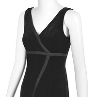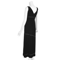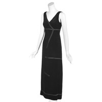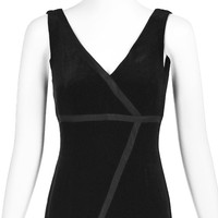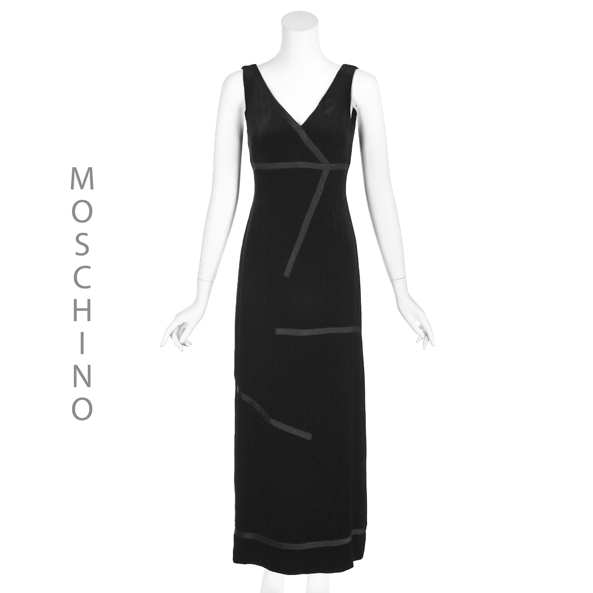 I have to admit that the photographs just can't quite convey the beauty of this alluring black velvet evening dress from Moschino Couture. The fabric is a very deep black silk velvet trimmed with asymmetrical black silk ribbons. The fabric label has been removed, but I believe the fabric is a 100% silk or a silk and rayon blend velvet that is extremely soft and pliable. The dress is sleeveless and has an empire waist defined by one of the black ribbons, and a deep V-neck. It is fully lined and closes with a back zipper; the lining is a synthetic fabric. Labeled US size 6. Please refer to the measurements for the best guidance regarding actual size and compare with a similar garment that fits you. MEASUREMENTS - Underarm chest measurement is 35" - Waist is 27" - Hips are 38" measured at 8-9" below waist. - Length is 47" from underarm down side seam and 46" down center back. CONDITION This 1990s Moschino Couture vintage dress is in excellent condition with no apparent flaws.