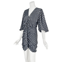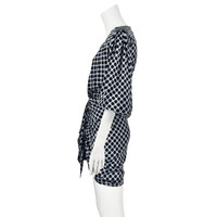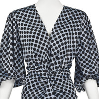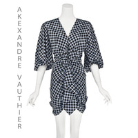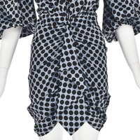 This striking mini dress from French haute couture fashion designer Alexandre Vauthier features a silk charmeuse fabric in a silvery blue color woven with large black dots. It has very full elbow length bishop's sleeves closed at the bottom with elastic. The top is actually open to the waist, but the photographer used fashion tape to partially close the front of the dress. The skirt is swagged upward from the hem to the waist with an additional piece that makes a soft ruffle down the center front. The entire dress is lined in the shell fabric, and it closes with a back zipper. The fabric is labeled 93% silk and 7% elastane. Labeled French size 38, which is considered equivalent to a US size 8. Although it does conform to Vauthier's size guide on the Neiman Marcus website for size 8, the measurements align with a US size 6, based on the latest modern size guide, also from the Neiman Marcus website, and the one we use most often. Please refer to the measurements for the best guidance regarding actual size and compare with a similar garment that fits you. The hips are stretchy, but the waist is not stretchy. MEASUREMENTS - Shoulder width is 15" - Underarm chest measurement is 35" - Waist is 27" - Hips measure 37" - Length is 32.75" down center back. CONDITION Excellent unworn condition with no apparent flaws. RETURNS Returns are accepted only if we are notified by you via email within three days after receiving your purchase. DO NOT SHIP UNTIL YOU HAVE OUR APPROVAL. We must receive your return within seven days after we approve it. The cost of return shipping is the buyer's responsibility. There is a 5% restocking fee for all returns. This fee can be waived at our discretion if we made a significant error in a listing.