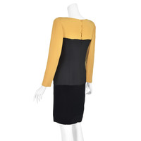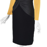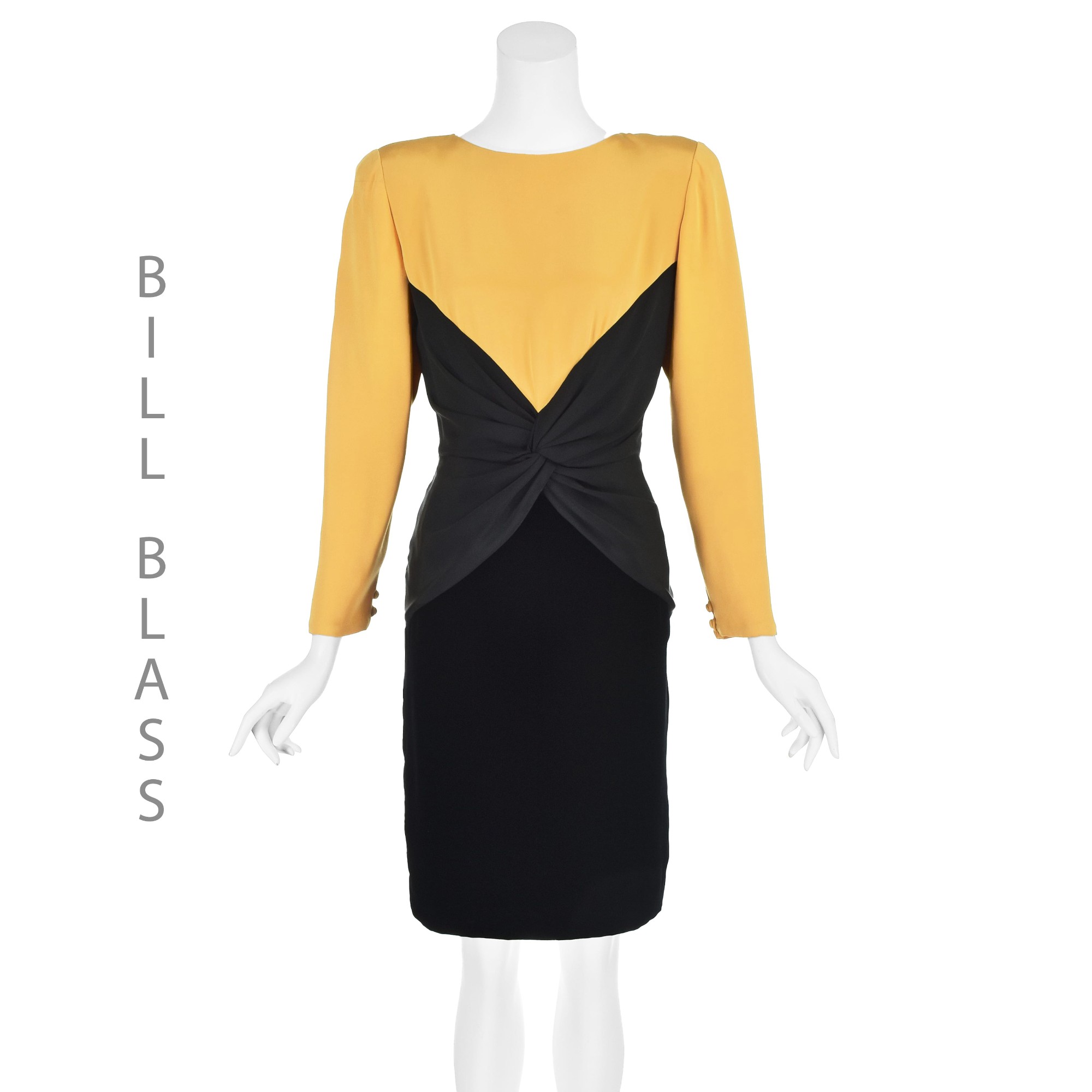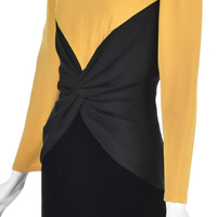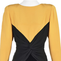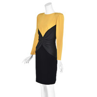 This classic early 1980s cocktail dress from the renowned Bill Blass conjures up visions of film noir heroines, supper clubs, and cynical private eyes in trench coats. The dress is structured in three layers, the top layer being an eggyolk yellow silk faille. It has shoulder pads (with bra strap holders), long sleeves, and self-covered buttons at the wrists and at the neck for closure. The torso is black silk faille twisted in the center with a zipper in back. And finally comes a black velvet pencil skirt, possibly 100% silk but more likely a silk and rayon blend. The top is double-faced with the eggyolk silk; the middle and skirt are lined with a lightweight black silk. There is no size label, but the measurements and sizing charts indicate the dress is closest to a modern size 8, based on the hip measurement. Please refer to the measurements for the best guidance regarding actual size and compare with similar garments that fit you. MEASUREMENTS - Shoulder width is 16" between seams and about 18" to outer edges of shoulder pads. - Underarm chest measurement is 39" - Waist is 31" - Hips measure 39" - Sleeve length is 23" from outer edge of shoulder pad. - Length is 36" down center back CONDITION This dress is freshly cleaned and in very sound condition with no issues to report. RETURNS We do not accept returns unless we made an egregious error in the listing. We do not consider slight differences in measurements or colors to be significant errors. If at our discretioin we agree to accept a return, you will pay for return shipping, and a 6% restocking fee will be deducted from your refund.