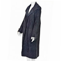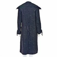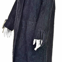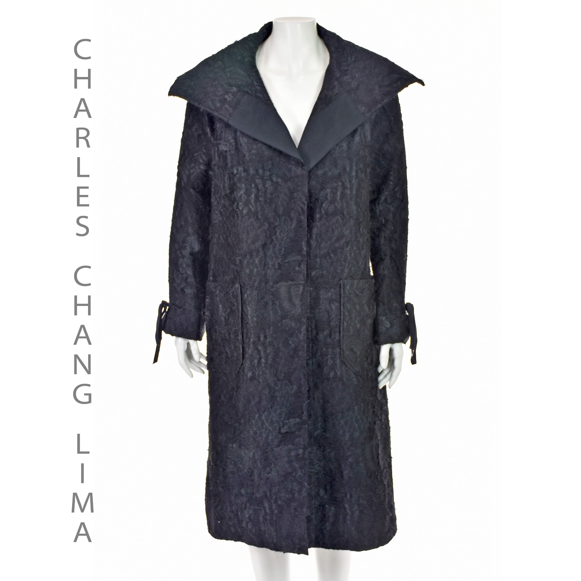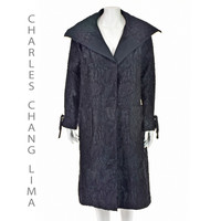 This black and green brocade coat from Charles Chang-Lima is a edgy couture design with an unexpected twist: The backside of the brocade is on the outside of the coat and has been deliberately distressed, giving the coat a shaggy appearance, while the usual "front" of the brocade fabric is on the inside of the coat. There are drawstrings on the back of the coat and at the cuffs to customize its fit and appearance. The inside front edges and the waist are trimmed/reinforced with black grosgrain ribbon, and there are a large patch pockets on each hip. The coat hangs open with no closures, like a duster or topper. Pieces of this caliber from the high-end Charles Chang-Lima label that closed in 2009 as a result of the recession are extremely rare. Labeled US size 10. Please refer to the actual measurements for the best guidance regarding size and compare with a similar garment that fits you. MEASUREMENTS - Raglan sleeves do not have shoulder seams, so width is variable. - Chest is 40" - Waist is 40" - Sleeve length is about 24" including a 2-inch cuff. - Length is 42" down center back. CONDITION Excellent unworn condition with no apparent flaws. Retains designers hang tag. RETURNS Returns are accepted only if we are notified via email within three days after you’ve received your purchase, including your reason for the return. DO NOT SHIP UNTIL YOU HAVE OUR APPROVAL. We must receive your return within seven days after we approve it. The cost of return shipping is the buyer's responsibility. There is a 5% restocking fee for all returns. This fee can be waived at our discretion if we made a significant error in a listing.