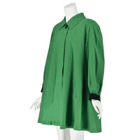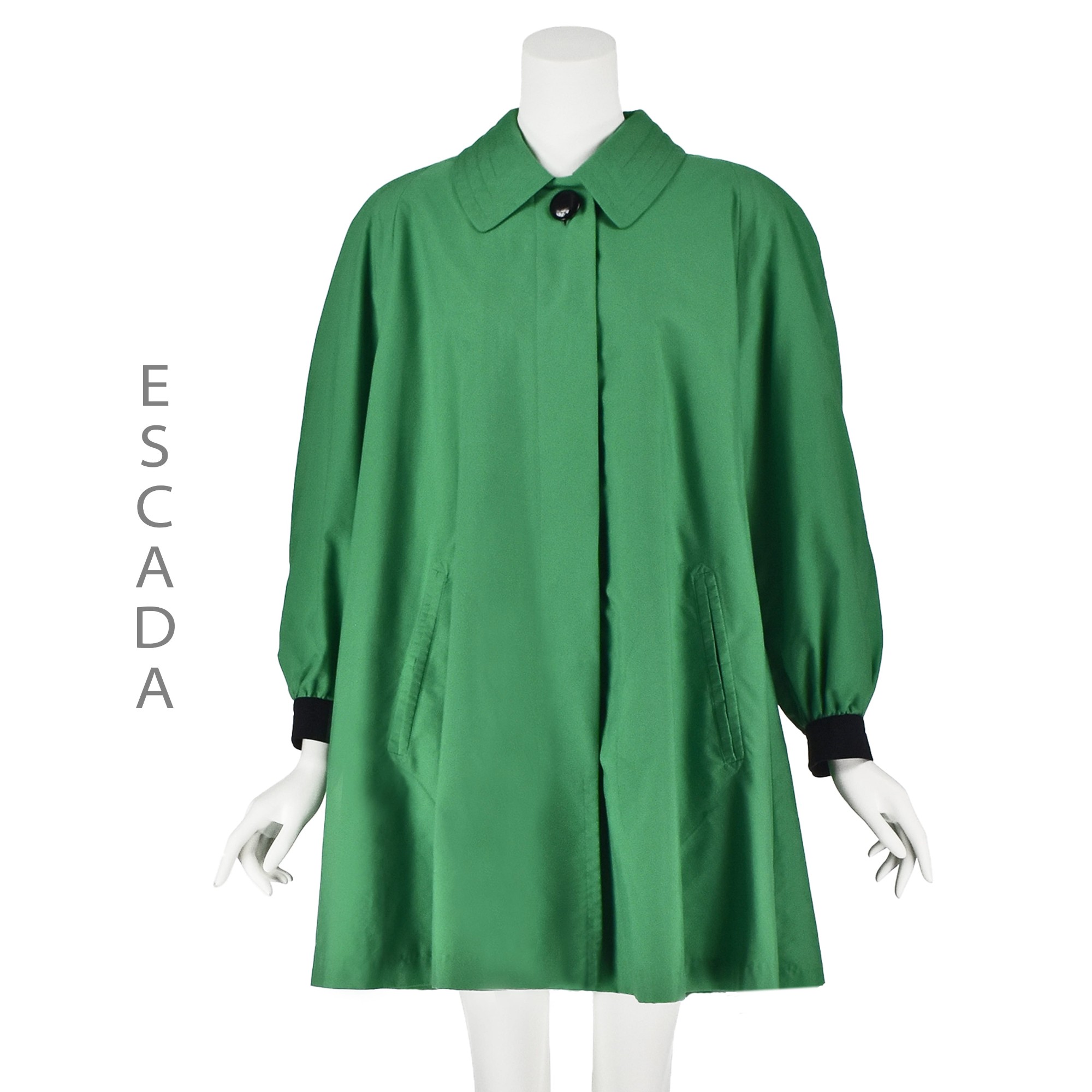 This lightweight vintage swing coat from Escada is perfect for fall through summer wear when a light wrap is needed for dining al fresco, perusing an outdoor art festival, or to add a spark of color to an otherwise ordinary outfit. This one is oversized and designed like an artist's smock with a basic collar, raglan sleeves with contrasting black cuffs, and very large vertical pockets. The back of the jacket is gathered at the base of the collar to add that "swing" element to the design. Closure is with five big black buttons, four of which are hidden by a button placket. Labeled 100% rayon (viscose). Labeled size M, which in the case of this jacket could be anywhere from 8-12. Please refer to the measurements for the best guidance regarding actual size and compare with a similar garment that fits you. MEASUREMENTS - Underarm chest measurement is 52.5" - Waist and hips are free. - Sleeve length is about 30" from center neck to end of cuff. - Length is 36" down center back excluding collar. CONDITION Excellent condition with no apparent flaws. RETURNS Returns are accepted only if we are notified by you via email within three days after receiving your purchase. DO NOT SHIP UNTIL YOU HAVE OUR APPROVAL. We must receive your return within seven days after we approve it. The cost of return shipping is the buyer's responsibility. There is a 5% restocking fee for all returns. This fee can be waived at our discretion if we made a significant error in a listing.