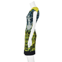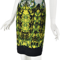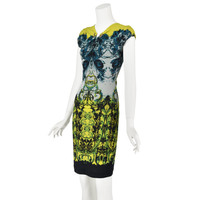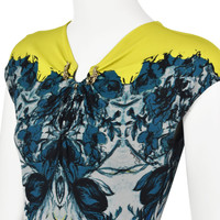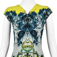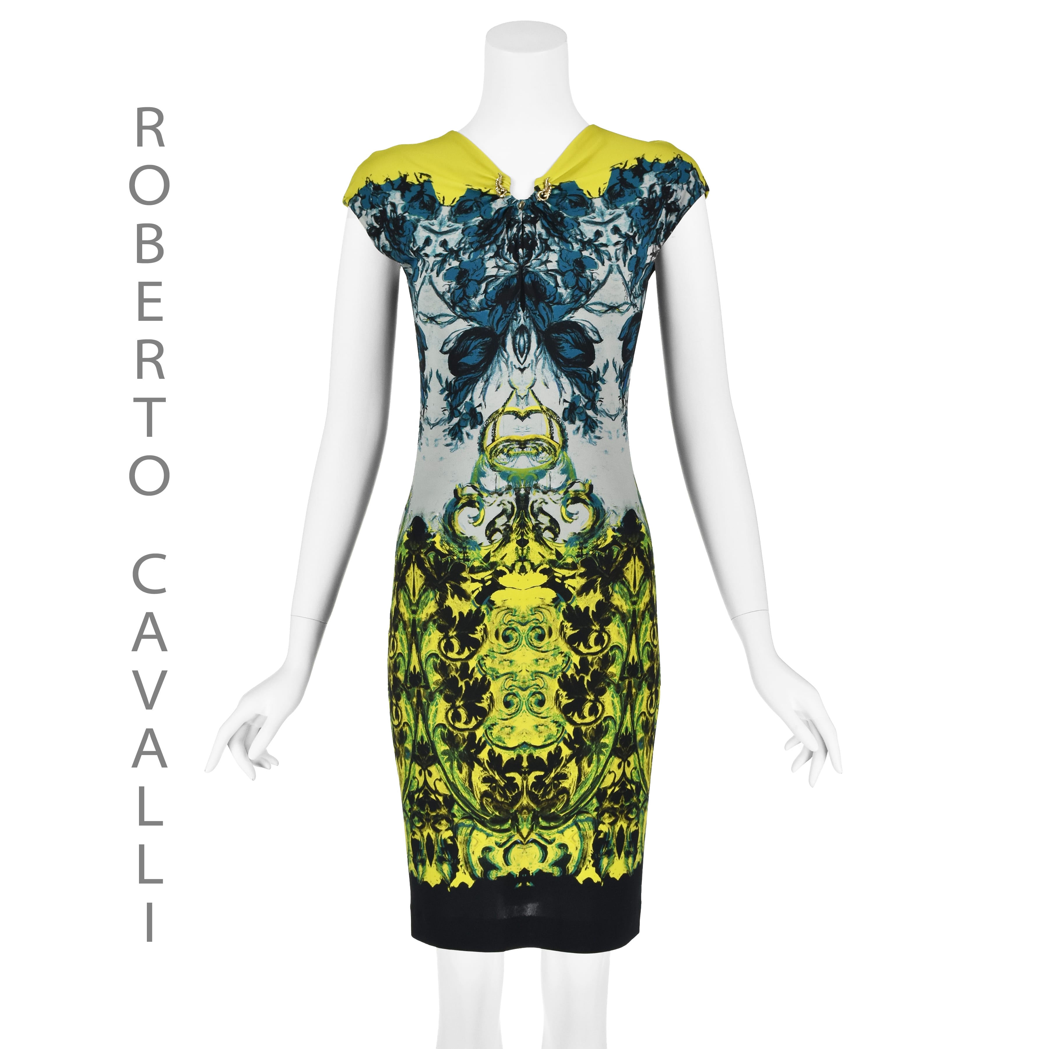 This is a colorful example of a Roberto Cavalli easily recognizable sheath dress in a stretchy knit, including Cavalli's signature metal adornment (in this case three). The dress has chartreuse yellow yoke with a teal and blue floral print that transitions to a yellow and black baroque print at the bottom. The dress is a pullover style with cap sleeves. It has a five-inch keyhole opening below the U-shape where the metal pieces are attached and a shorter keyhole opening at the back of the neck that closes with one button. The dress is lined in a solid black semi-sheer knit. The size, fabric, and care tags have been removed - they are several inches long, so it's understandable - but Roberto Cavalli dresses like this are usually a viscose or polyamide and elastane blend. I've compared the measurements of this dress with similar Cavalli dresses, and it appears to be an Italian size 42, or a US size 6 (Medium). Please refer to the measurements for the best guidance regarding actual size and compare with a similar garment that fits you. This dress is stretchy; measurements taken with the knit relaxed. MEASUREMENTS - Underarm chest measurement is 32" - Waist is 27" - Hips are 33" measured between 8-9" below waist. - Length is about 38.75" down center back. CONDITION Excellent condition with no apparent flaws. Fabric and care tags have been removed. RETURNS Returns are accepted only if we are notified by you via email within three days after receiving your purchase. DO NOT SHIP UNTIL YOU HAVE OUR APPROVAL. We must receive your return within seven days after we approve it. The cost of return shipping is the buyer's responsibility. There is a 5% restocking fee for all returns. This fee can be waived at our discretion if we made a significant error in a listing.