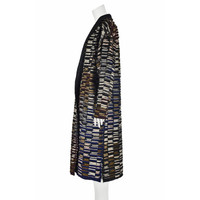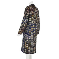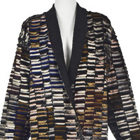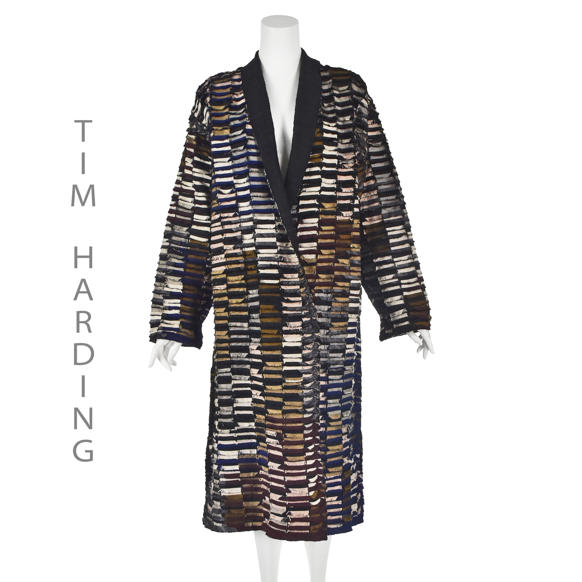 This unique "art-to-wear" duster is made by renowned fiber artist Tim Harding, and it's signed by the artist in bronze paint on the inside of the coat. The fold back collar and lapels reveal the black dupioni silk shell that Harding has completely covered in layered strips of different types of silk with raw edges. Although the colors vary widely from beige to royal blue to maroon and bronze, there is a an overall unifying element in the transition of the colors around the coat. The coat has on-seam pockets and no closure, so wear it as a robe or a duster in the daytime to an upscale brunch or in the evening as stunning outerwear to a dressier occasion - or as loungewear when you're feeling particularly indulgent. According to the measurements, and for a slightly oversized look, the coat would work well for sizes in the 6-8 range. Please refer to the measurements for the best guidance regarding actual size and compare with a similar garment that fits you. NOTE: Shipping cost includes insurance. MEASUREMENTS - Shoulder width is 21.5" - Underarm chest measurement is 44" - Straight sides are 44" all the way down. - Sleeve length is 21" - Length is 47" down center back excluding collar. CONDITION Excellent unworn condition with no apparent flaws. RETURNS Returns are accepted only if we are notified by you via email within three days after receiving your purchase. DO NOT SHIP UNTIL YOU HAVE OUR APPROVAL. We must receive your return within seven days after we approve it. The cost of return shipping is the buyer's responsibility. There is a 5% restocking fee for all returns. This fee can be waived at our discretion if we made a significant error in a listing.