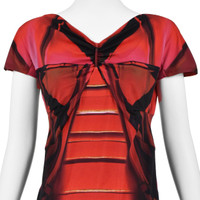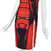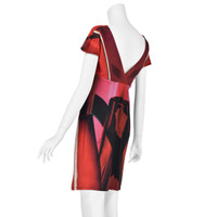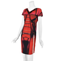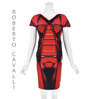 This bold sheath dress from Roberto Cavalli features an abstract expressionist print in red and black on a very stretchy nylon and elastane knit fabric. The dress has a V-neck with raglan shoulders and little cap sleeves. The bodice is very tightly ruched at the bottom of the V-neck. The back has a crossover V and a raised waist. It's a pullover style, so there is no separate closure. The fabric is 88% polyamide (nylon) and 12% elastane, which makes the dress both stretchy and resiliant. Labeled Italian size 46 which is comparable to US size 10-12, or Large. Please refer to the measurements for the best guidance regarding actual size and compare with a similar garment that fits you. Measurements taken with the knit relaxed. MEASUREMENTS - Underarm chest measurement is 38" - Waist is about 36"" - Hips are 38" measured between 8-9" below waist. - Length is about 38" from top of shoulder. CONDITION Excellent condition with no apparent flaws.