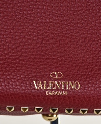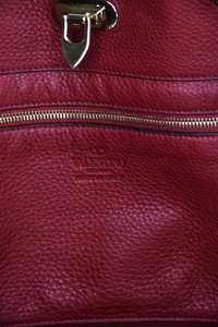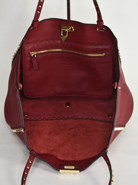 This is a Valentino Rockstud Tote in a gorgeous deep red color. Although it is officially referred to as "medium" size, it is the largest size that Valentino made in this style. The front and back faces of the bag measure 12.75" x 9.25" and are surrounded on three sides with Valentino's iconic "rockstuds." These rockstuds are a soft color that is a cross between gold and silver, referred to by the maker as "platinum." When laid flat, the full width of the bag at the top is about twenty inches wide. It has double handles and comes with a separate shoulder strap, all of which are adorned with platinum-colored rockstuds. The interior of the bag is suede (the backside of the pebbled leather, not a separate lining). There is a wide zippered pocket on one side of the interior. Closure is with a large clasp at the middle top. The two little red envelopes in the last photo contain extra rockstuds and cleaning instructions. I do not have the dustbag. Shipping cost is to a US address and includes insurance. APPROXIMATE MEASUREMENTS - Height is 10 inches including metal feet on bottom of bag. - Width is 9.25 inches (bottom) to 20 inches (top). - Depth is about 5 inches - Handle drop is 7 inches - Shoulder strap drop is 20 inches CONDITION The condition of this bag, both inside and outside, is as close to brand new as you are likely to ever find outside of a retail store. There is no wear on the corners and the interior is spotless. RETURNS No returns for accessory items including handbags, shoes, scarves, gloves, etc.
