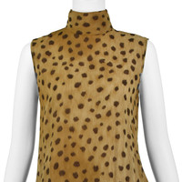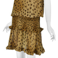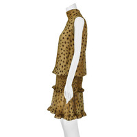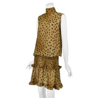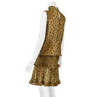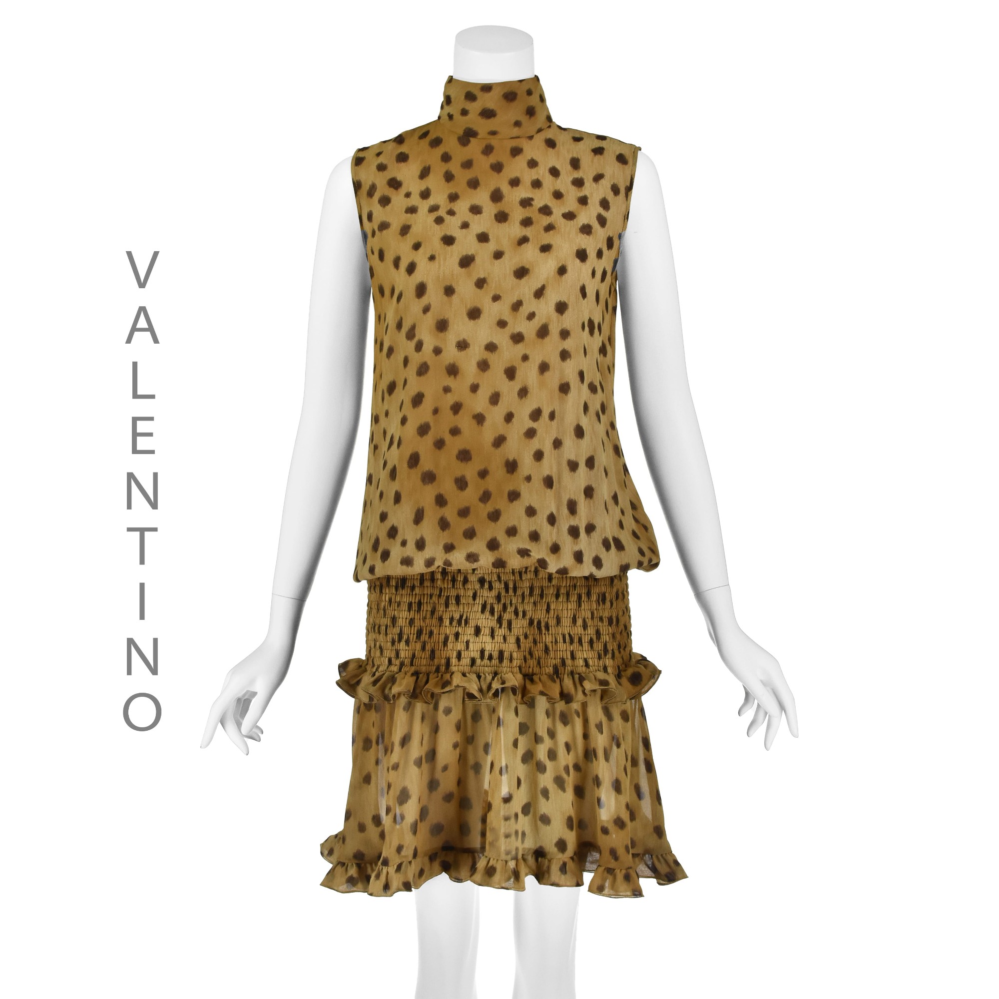 The appealing style of this vintage 1980s dress from Valentino Garavani is enhanced even more by the use of a lively leopard print fabric. The top of this sleeveless dress has a raised neck and a long blouson torso. The opening at the back is about fourteen inches long and closes with a single button at the neck. This top is attached to a five-inch wide wide elasticized and smocked hipband that together give the appearance of a dropped waist. It is followed by the actual skirt with double rows of ruffles at the top and bottom. One of the last photos shows how the dress is constructed with the real waist of the skirt hidden inside the dress. It has an elastic waistband and its own zipper. The fabrics are not labeled, but the shell fabric is silk crepe, the torso is lined in beige silk chiffon, and the top of the skirt inside the dress is a very fine silk organza. Labeled US size 6, but measurements and sizing charts indicate this dress is a better suited for a modern US size 4. This is our estimated size, so please refer to the actual measurements for the best guidance regarding size and compare with a similar garment that fits you. MEASUREMENTS - Shoulder width is 14.5" - Underarm chest measurement is 37" - Elastic waist inside dress is 24" - Hips are 34" measured in the middle of smocked band that is stretchy. - Length is about 40" down center back excluding collar. Dress will be shorter when worn, depending on where you position the hip band. CONDITION The leopard print shell is in excellent condition with only a couple of inconsequential thread pulls at the very bottom ruffle. The channel that holds the elastic for the skirt's waistband inside the dress has three short splits on the backside of the waistband that are visible only if you stretch the elastic. The taffeta below the waistband has a couple of areas that were "starting" that we've reinforced, but overall the material is strong. Of course, this part of the dress is not visible on the exterior. RETURNS This dress is delicate, and we are likely not to approve a return for it. Our general return policy is as follows: Returns are accepted only if we are notified by you via email within three days after receiving your purchase. DO NOT SHIP UNTIL YOU HAVE OUR APPROVAL. We must receive your return within seven days after we approve it. The cost of return shipping is the buyer's responsibility. There is a 5% restocking fee for all returns. This fee can be waived at our discretion if we made a significant error in a listing.