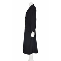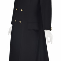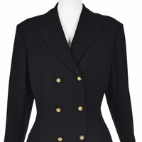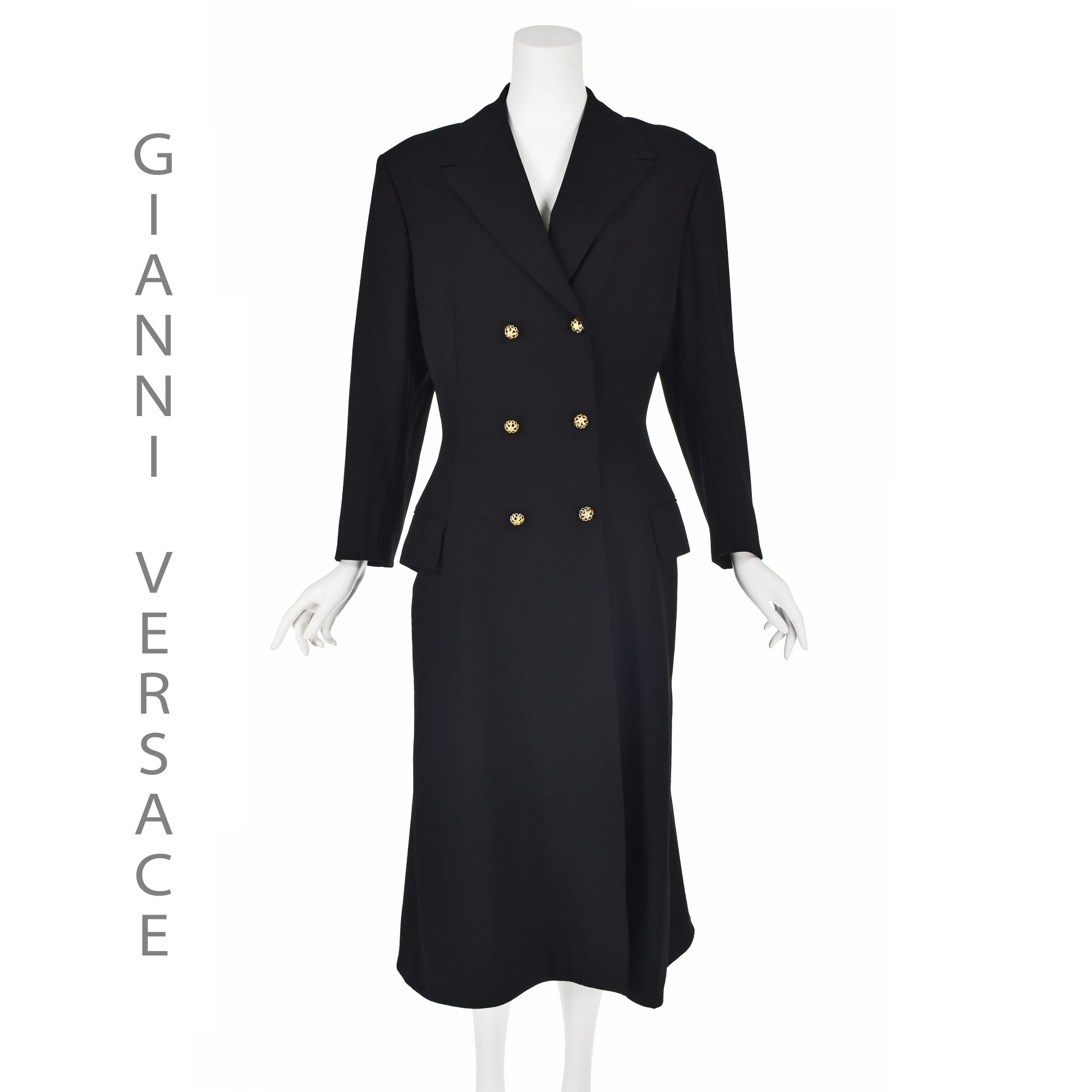 This magnificent black gabardine coat from Gianni Versace features a double-breasted design with a fitted waist and a very full skirt in back. It has medium-wide lapels with a notched collar, medium shoulder pads, and a flap pocket on each hip. The black buttons are covered with gold-tone metal filagree. The coat tapers at the waist, which accentuates the extremely full skirt on the back of the coat. The total sweep around the bottom of the coat is 96" - 28" in front and 68" in back - fuller than it appears to be in the last photo before the label. Labeled 100% wool. The style of the designer label places the coat in the late '80s to early '90s. There is no size label, but measurements indicate that it is closest to a modern size 8. For an overcoat without a size label, we deduct about three-four inches from the actual chest and waist measurements to determine size. If this coat were worn as a dress, the estimated size would be 10. Please refer to the measurements for the best guidance regarding actual size and compare with a similar garment that fits you. MEASUREMENTS - Shoulder width is 19" - Chest is 40" - Waist is 34" - Hips are free. - Sleeve length is 23" - Length is 48" down center back excluding collar. - Sweep is 96" total: 28" in front and 68" in back. CONDITION Excellent condition with no apparent flaws. The gabardine is lovely and not shiny anywhere from being pressed.