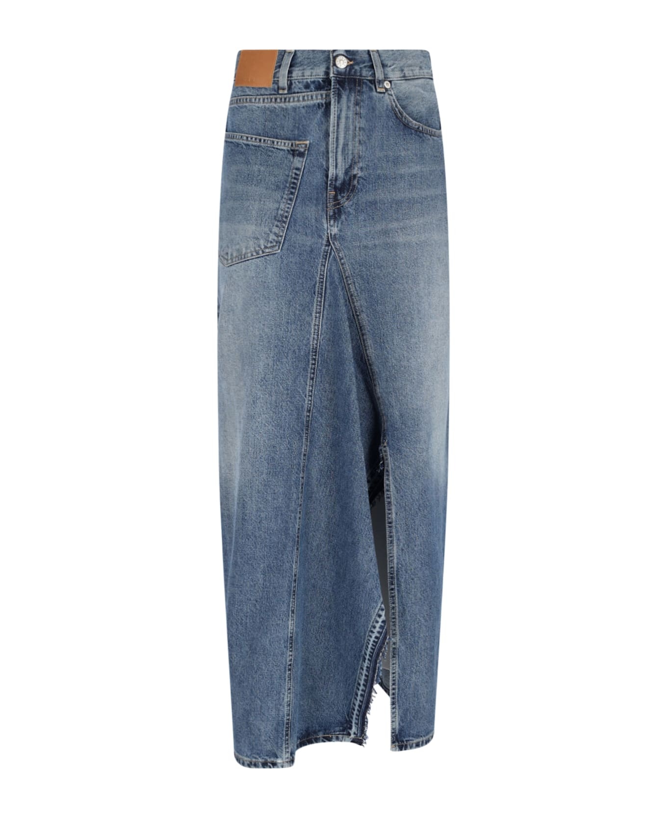 6397 deconstructed maxi skirt in blue denim with usured wash, low waist, belt loops, button and zip closure, five pockets design, side logo patch, maxi central front and back split, straight hem. Composition: 100% Cotton Made in: Italy Color: Blue Size and fit: - vestibilita morbida Model number: NS106MVMEDIUMVINTAGE