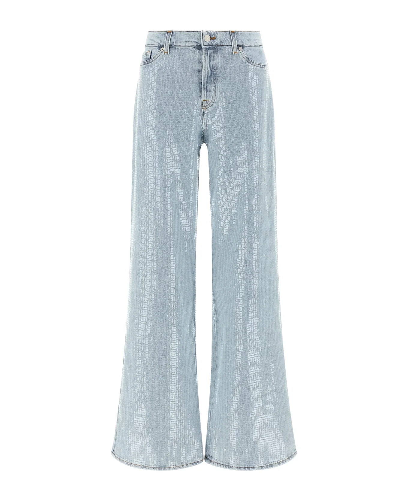 Lotta' cotton denim jeans with all-over tone-on-tone sequin applique, low-waisted model with wide, flared leg, front button closure, five pockets, and back logo tag. Composition: 99% cotton, 1% elastane Made in: Tunisia Color: Light Blue Size and fit: - true to size fit Model number: 7UG2PC10U71ZX