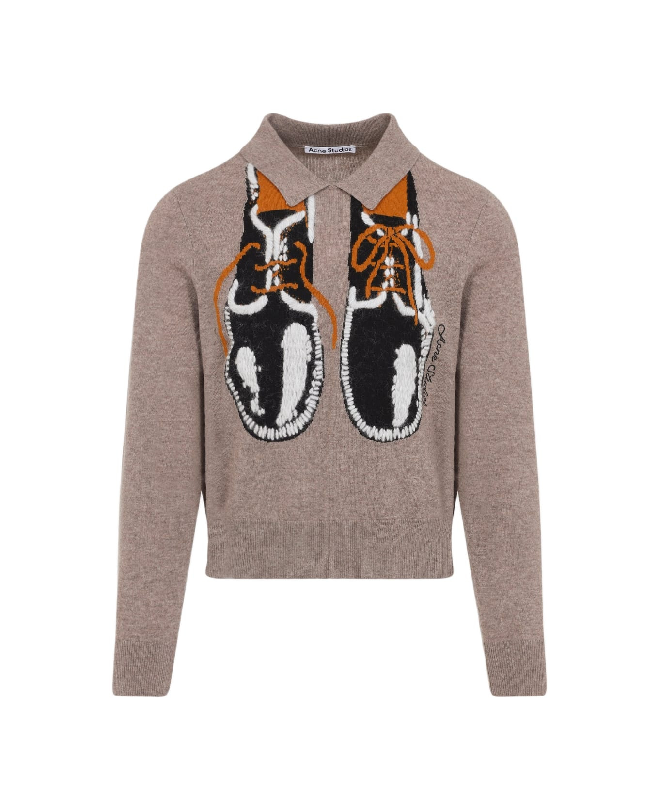 Acne Studios Beige Wool Sweater. Crafted from beige wool, polo collar, front jacquard Klastron shoes, long sleeves, ribbed edges, straight hem. Color: Drn Greige Melange Model number: B60372DRN