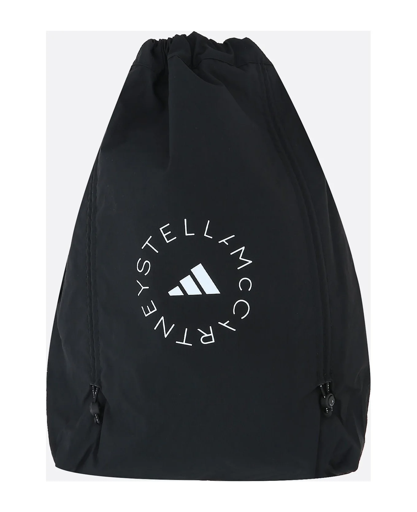 adidas by Stella McCartney gym sack made of black recycled nylon with a front logo print. It features black-tone hardware, a drawstring closure, side zip opening and a top handle. The black nylon-lined interior includes a zip pocket. The design is completed with a side zip pocket and elastic drawstrings to adjust the volume. Composition: 100% recycled polyamide Made in: China Color: Black Size and fit: - Width 31.5 cm - Height 47 cm - Depth 13.5 cm Model number: JJ4693BLACK/WHITE