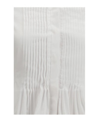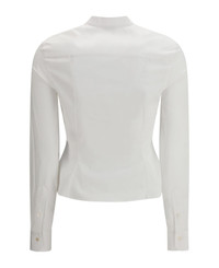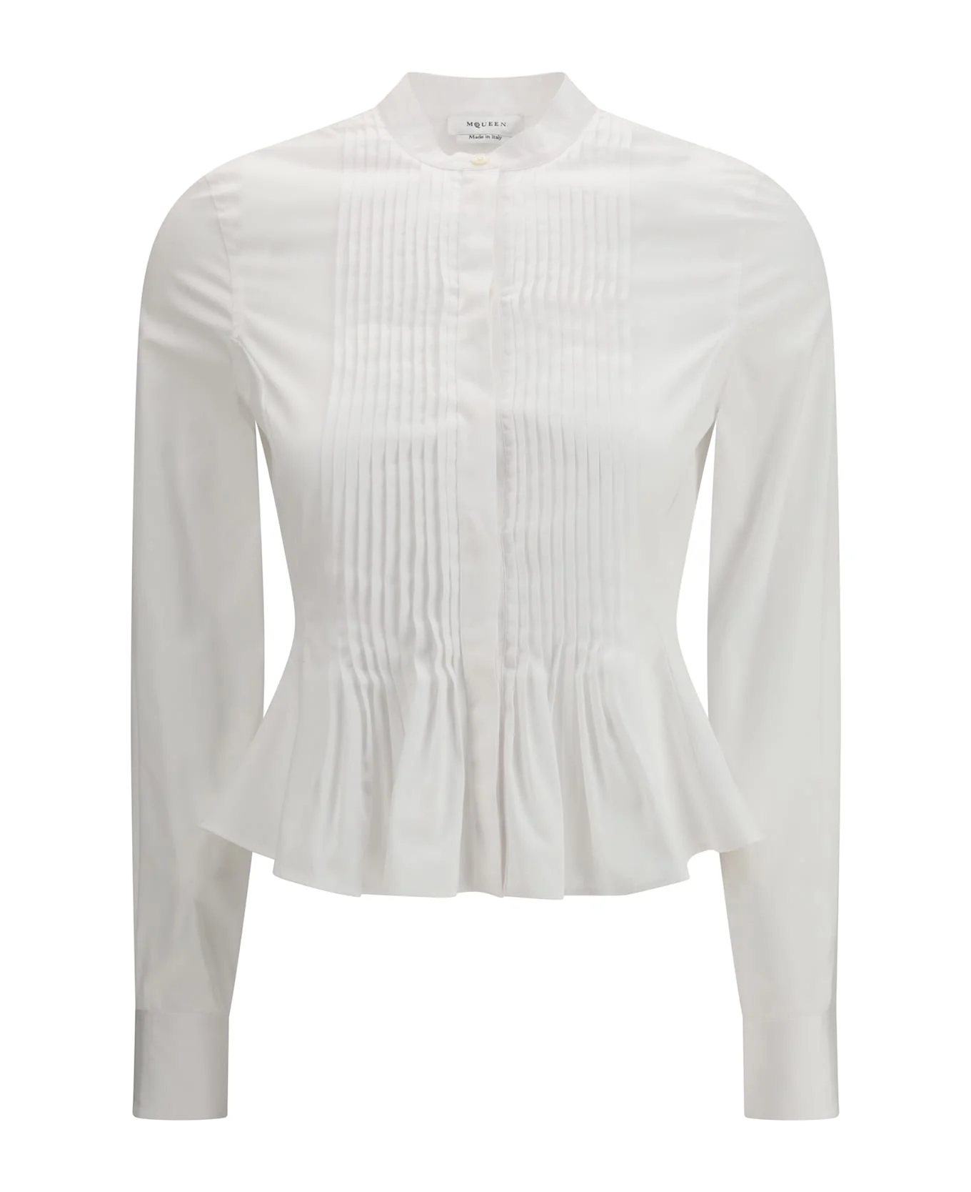The cotton shirt by alexander mcqueen embodies refined, timeless elegance through its tailored and feminine silhouette. the fitted cut with a subtle peplum delicately enhances the figure, while the long sleeves finished with classic cuffs pair seamlessly with the stand-up collar. narrow vertical pleats on the front add depth and understated character to the design, preserving a clean, minimalist aesthetic. crafted from impeccably smooth white cotton, it offers exceptional comfort and a luxurious appearance, suitable for both day and evening wear. the concealed front button placket completes the piece with discreet sophistication and versatile appeal. Composition: 100% % Cotton Made in: Italy Model number: 848071QAABS9000