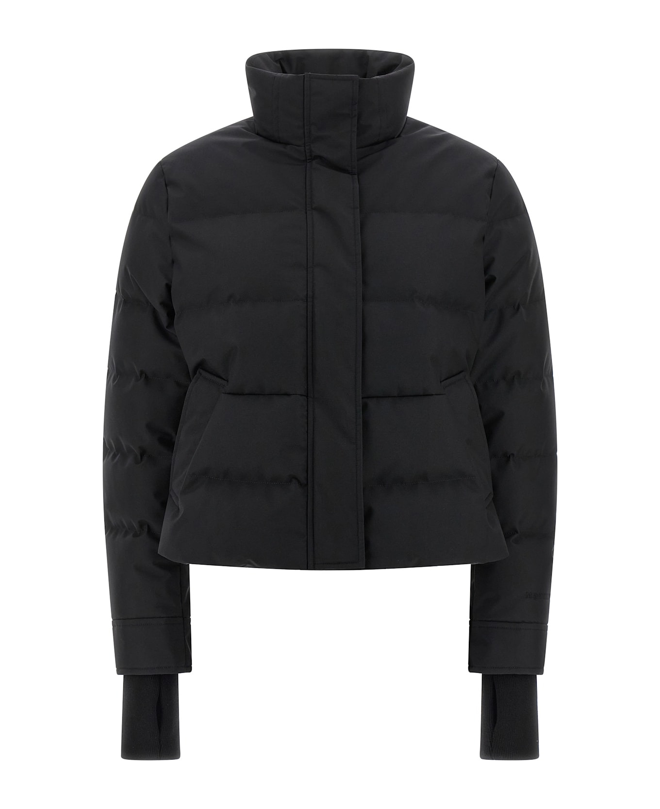 Quilted and goose feather padded technical fabric down jacket, crop style with hourglass silhouette, standing collar, zip and snap button closure on the front, pockets, long sleeves with knitted cuffs and tone-on-tone embroidered logo, slightly ruffled hem. Composition: 100% polyamide Made in: Italy Color: Black Size and fit: - true to size fit Model number: 842818QEAG11000