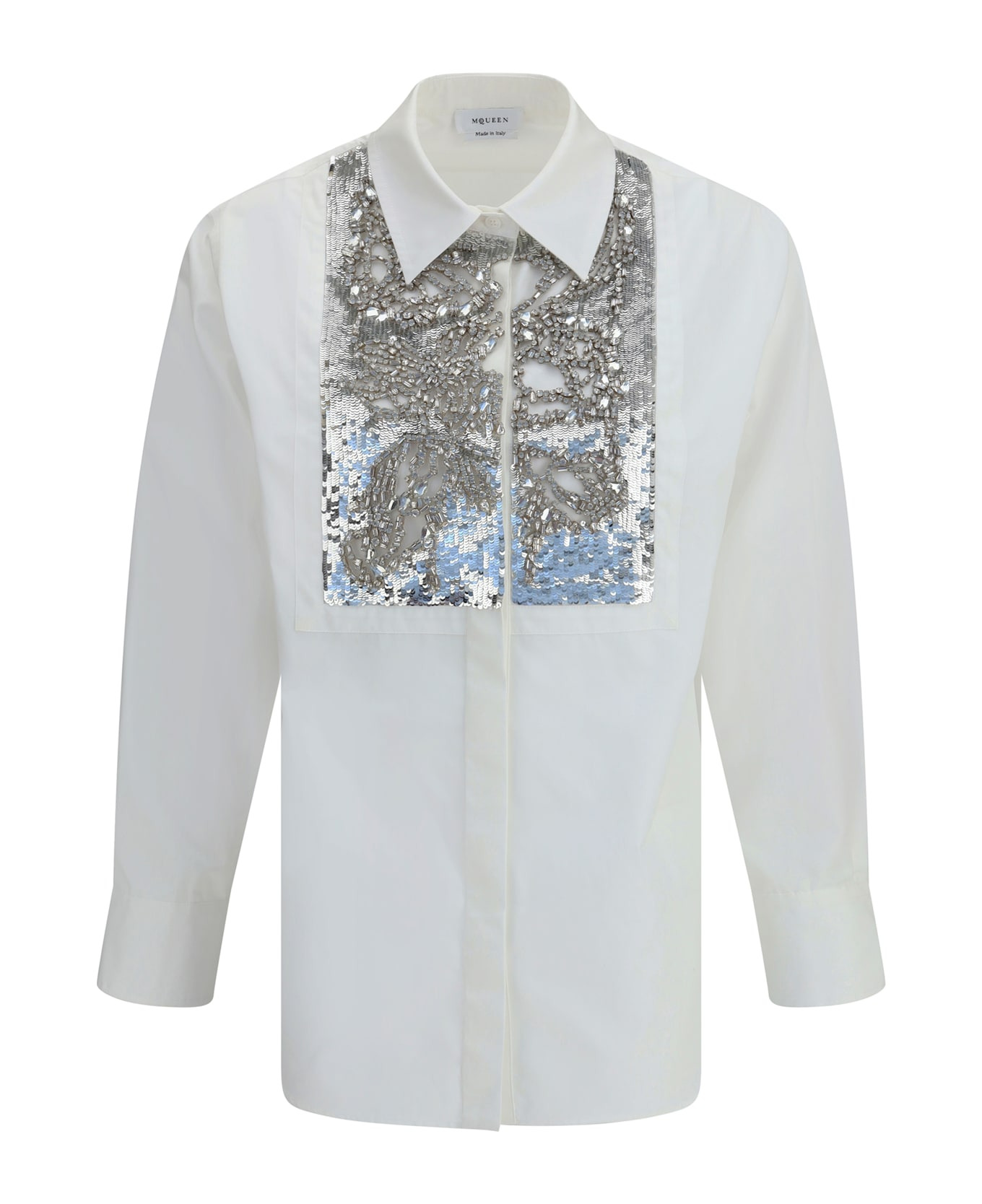 The alexander mcqueen crystal embroidered shirt is a refined piece in optical white cotton poplin. featuring an italian collar and a curved hem, it features a crystal stencil technical embroidery on the front that adds a sophisticated and modern touch. the hidden front button fastening completes the clean and elegant design. Composition: 100% % Cotton Made in: Italy Model number: 838811QZAPS9000