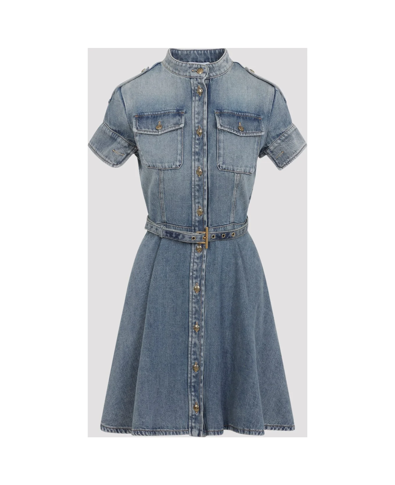 Alexander McQueen Light Blue Denim Mini Dress. Crafted from washed light blue cotton denim, featuring a Korean collar, button tabs at the shoulders, two front flap pockets on the chest, front button fastening, a tonal detachable belt at the waist, short sleeves with buttoned cuffs, and a flared mini skirt. Made in: Italy Color: Light Blue Wash Model number: 857116QMAD14383