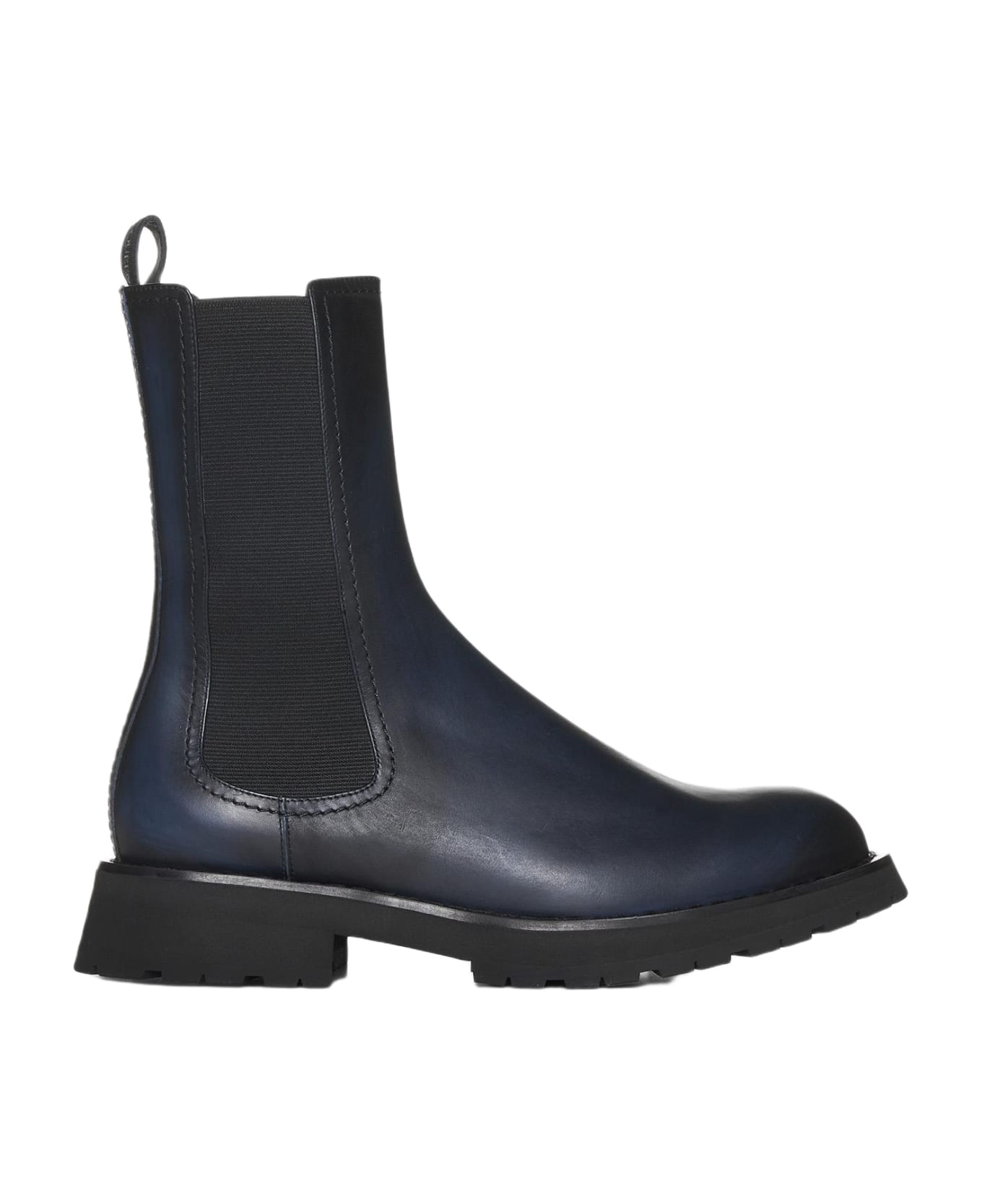 Alexander McQueen's Chelsea leather boots in shades of grey and blue featuring a round toe, black stretch fabric side panels, rear fabric loop tab in with logo and rubber tread sole. Composition: 100% calfskin Made in: Italy Color: Grey Size and fit: - W Heel 2 in / 5 cm x H x D cm handle Platform 1 in / 2,5 cm Model number: 711120WHU351160