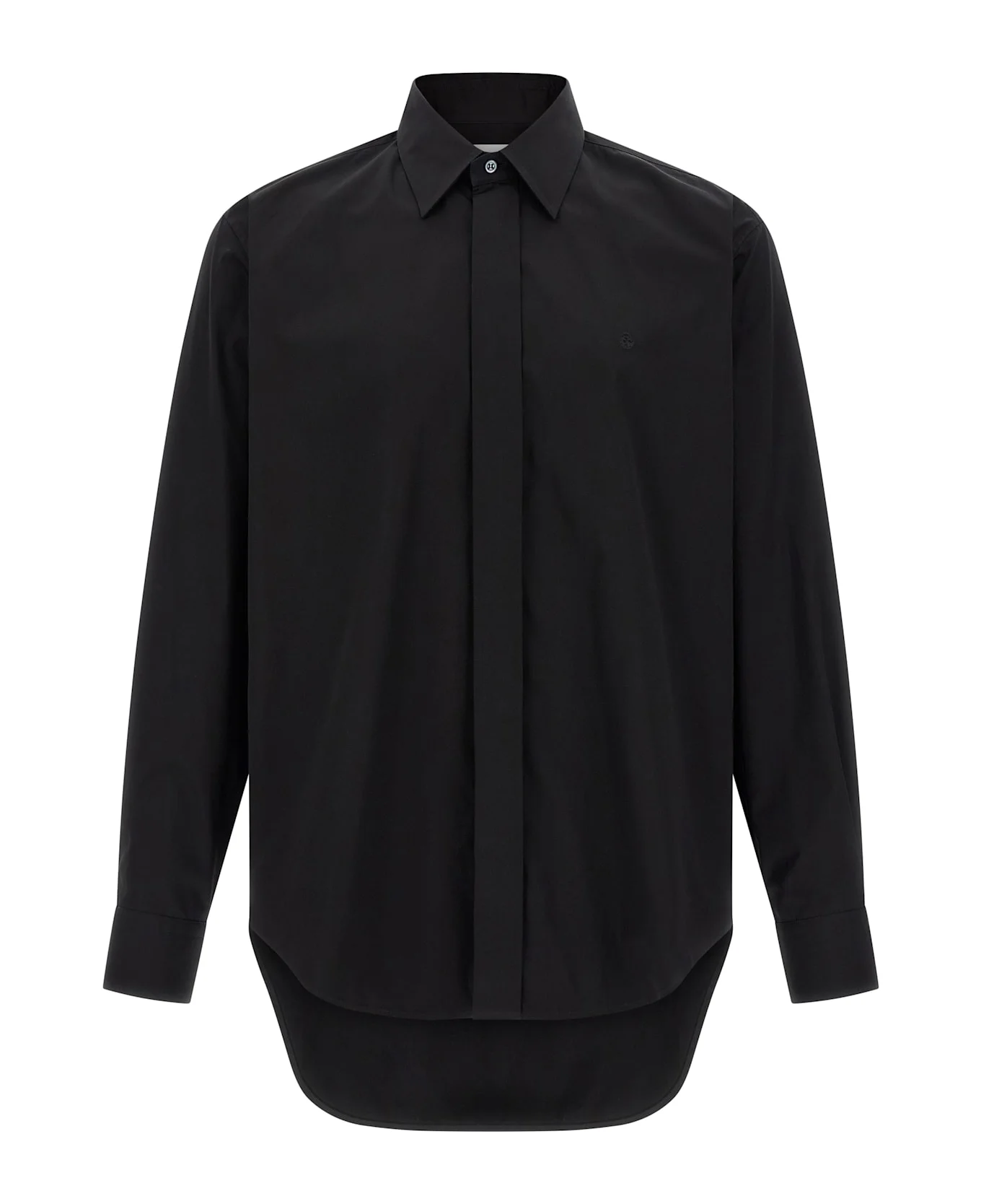 Cotton poplin shirt with tone-on-tone logo embroidery and concealed front button closure, long cuffed sleeves for cufflinks. Composition: 100% cotton Made in: Romania Color: Black Size and fit: - relaxed fit - COLLAR US size Model number: 826636QNAAX1000