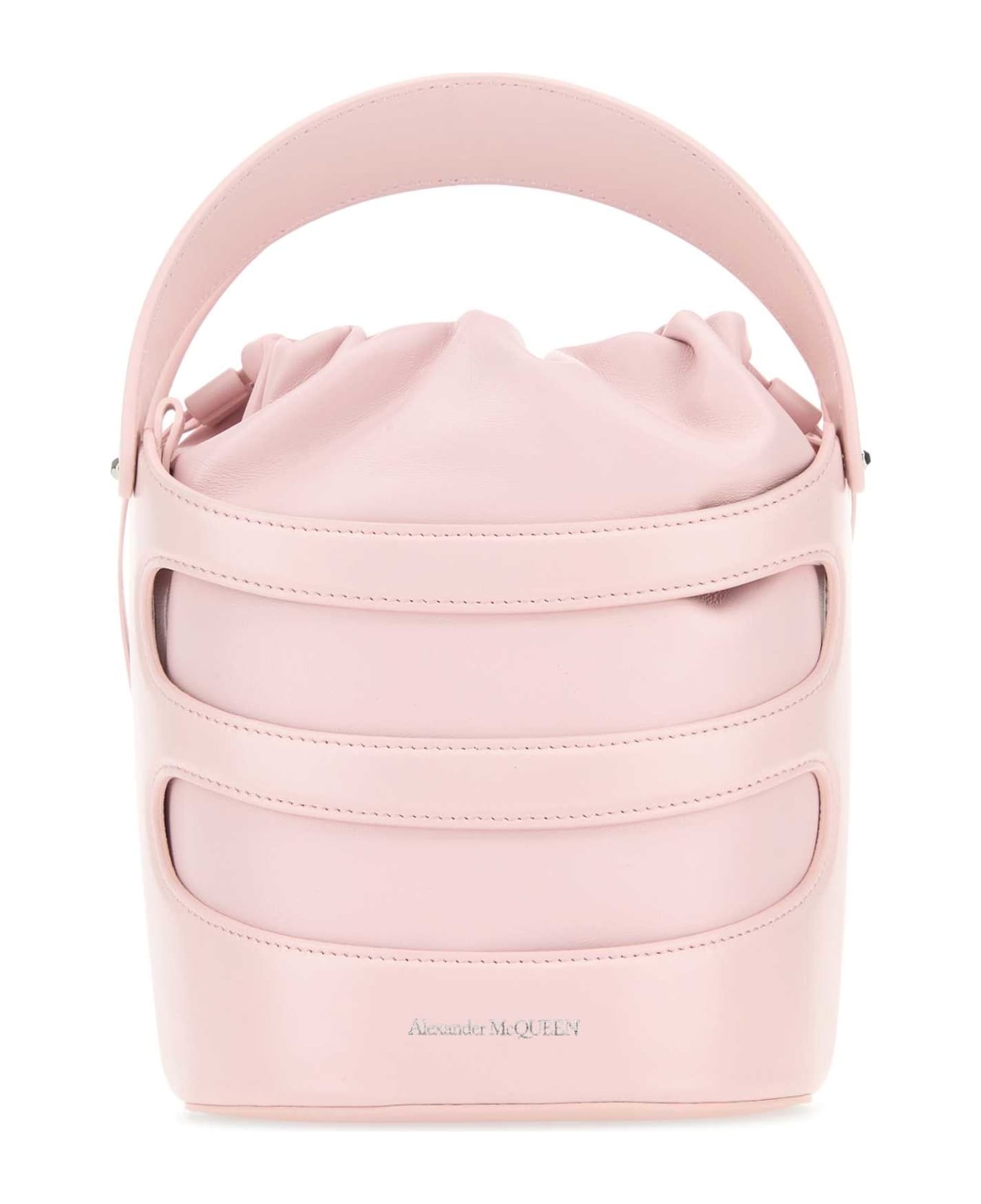 Pastel Pink Leather The Rise Bucket Bag from Alexander McQueen Made in: Italy Color: VENUS Size and fit: - Width: 16 cm Height: 18 cm Depth: 14,5 cm Handle height: 9 cm Min shoulder strap length: 33 cm Max shoulder strap length: 55 cm Model number: 7871261VPHI9813