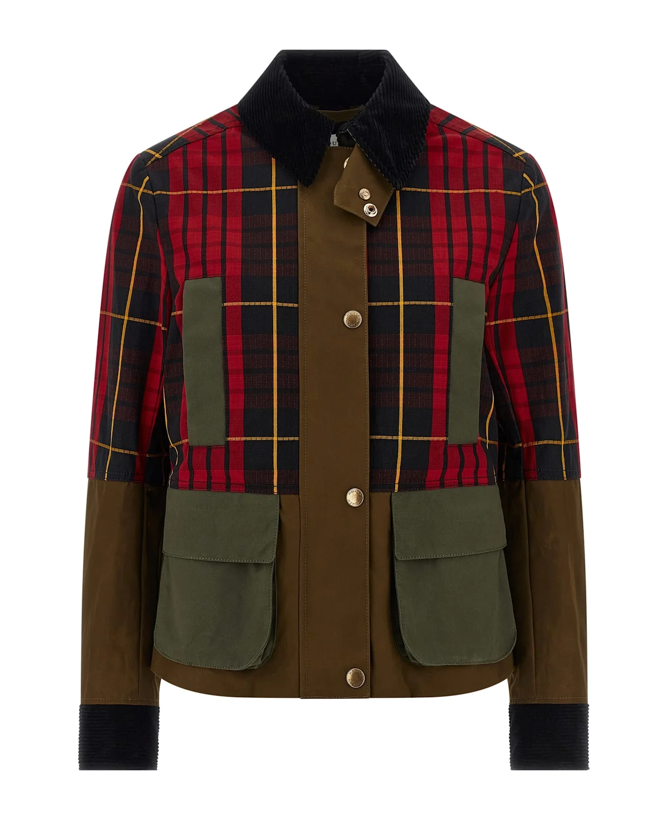 Solid color waxed cotton jacket and tartan ripstop panels, patchwork construction, contrast corduroy shirt collar and cuffs, front zip and snap button closure, pockets, long cuffed sleeves, and adjustable side straps at the waist. Composition: 60% cotton 40% viscose Made in: Italy Color: Multicolor Size and fit: - true to size fit Model number: 851081QEAHN6120