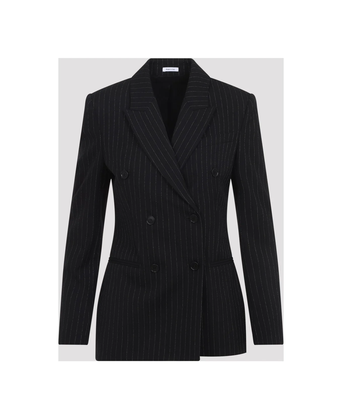 Alexander McQueen Pinstripe Lurex Black Wool Jacket. Crafted from black wool with lurex pinstripe motif, featuring peak lapels, a double-breasted construction, button fastening, a welt pocket on the chest, two pockets on the front, reinforced shoulders, long sleeves with buttoned cuffs, two back vents and a full lining. Made in: Italy Color: Black Gold Model number: 857603QJAFX1389