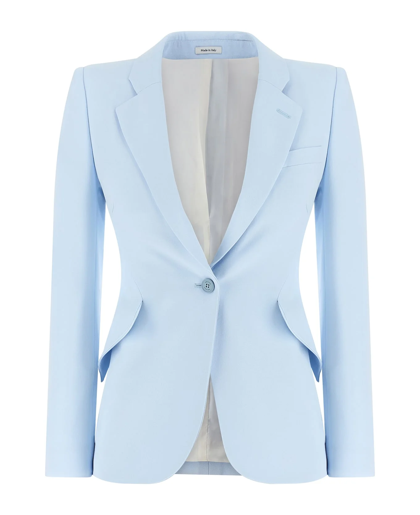 Single-breasted thin crepe blazer with front button closure, hourglass silhouette, mirror lapels, breast pocket, flap pockets, structured and padded shoulder strap, long sleeves, chain with metal T-detail and back split, lining. Composition: 52% viscose, 48% acetate Made in: Italy Color: Light Blue Size and fit: - true to size fit Model number: 857750QEAAA4602