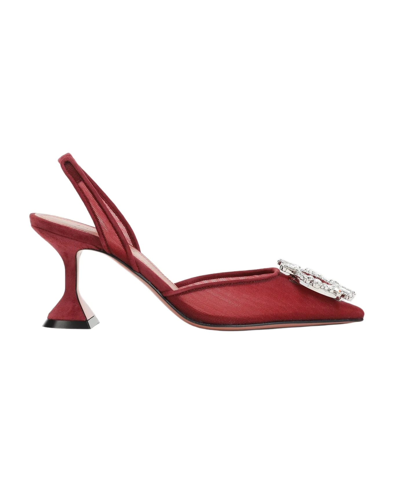 Amina Muaddi Begum 70 Red Mesh Pumps. Crafted from dark red mesh and suede leather, pointed toe, signature metal plaque embellished with crystals on the front, tonal strap on the back, covered spool heel, leather insole and outsole. Made in: Italy Color: Ruby Size and fit: - Heel high: 7cm Model number: 15S365637BEGRUBY
