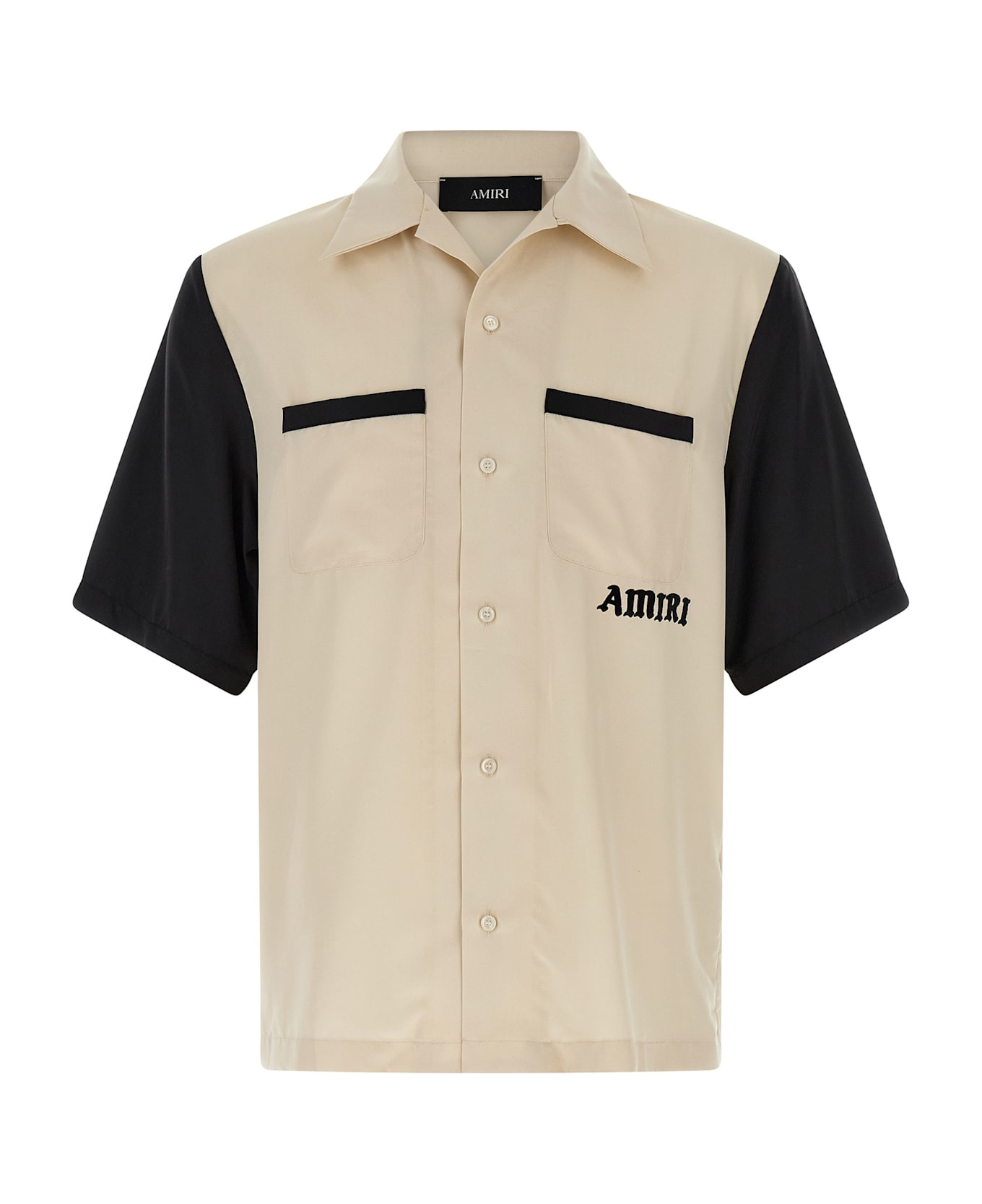 'Alabaster' V-neck shirt with button closure lapels, front pocket applique, front button closure, back flocked print and contrasting short sleeves. Composition: 60% modal 40% polyester Made in: Italy Color: Multicolor Size and fit: - True to size fit Model number: AMSTCA1149ALABASTER