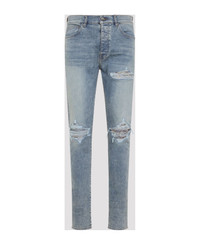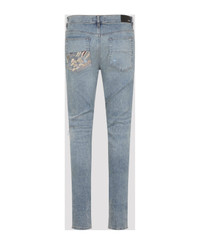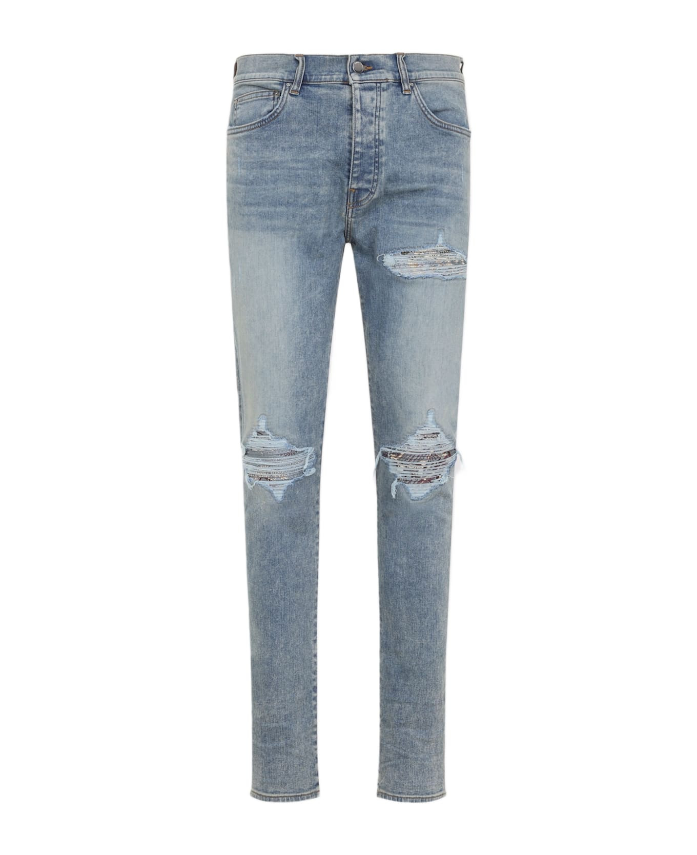 Amiri Crane MX1 Blue Cotton Jeans. Crafted from bleached light blue cotton denim, low-rise, belt loops, 5-pocket construction, distressed effect with gold-toned fabric inserts, patch at the back pocket, branded leather label at the back waistband, slim fit. Made in: United States of America Color: Medium Indigo Model number: AMDNSY1172MEDIUM